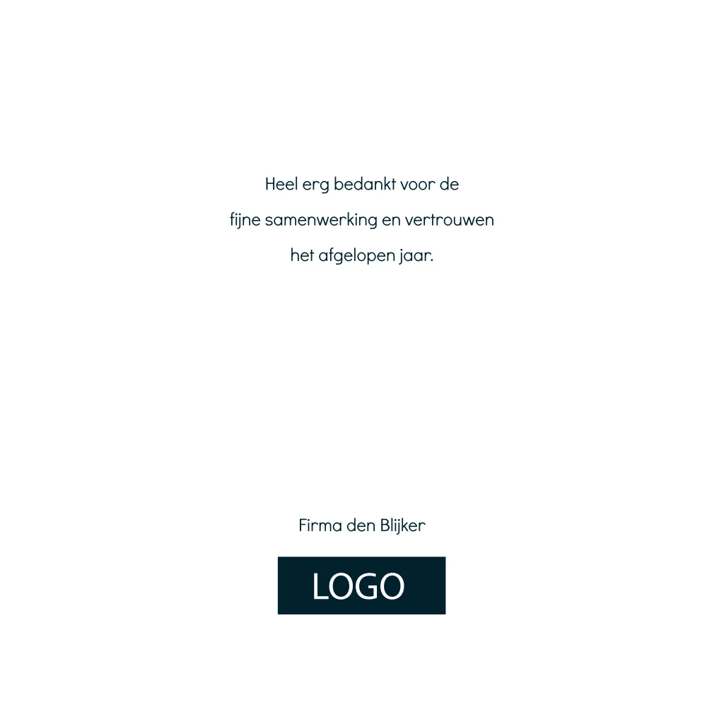 Wens je zakelijke relaties, medewerkers en klanten een sparkling New Year met deze luxe zakelijke kerstkaart. Uniek aan deze kerstkaart is het gebruik van écht foliedruk, namelijk goudfolie. Op deze kaart een mooie donkerblauwe achtergrond met gouden spetters. De afbeelding van het logo op de binnenzijde dient als voorbeeld en wordt niet gedrukt. Deze kun je verwijderen of plaats hier je eigen logo overheen.