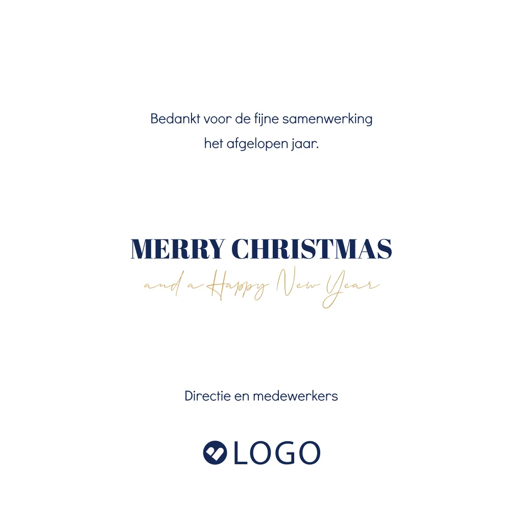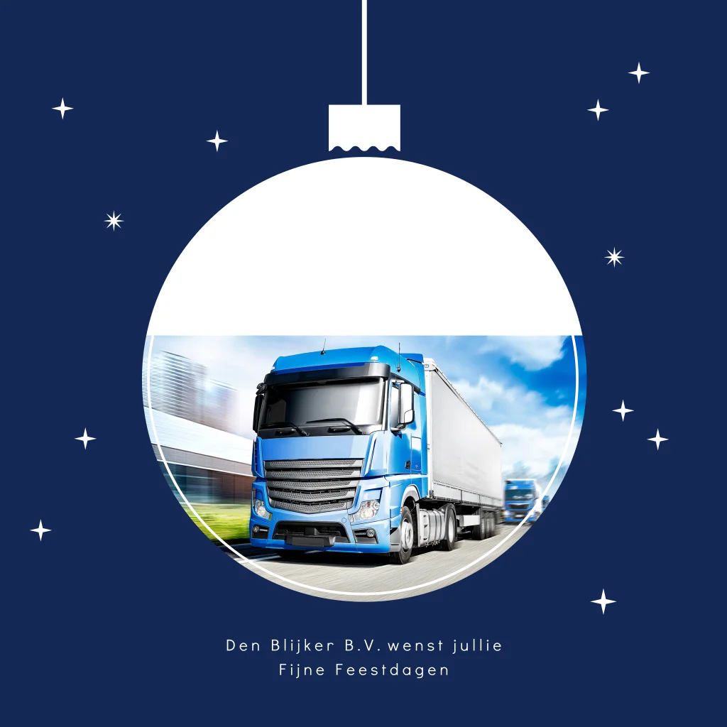 Verras jouw zakelijke relaties met een zakelijke kerstkaart in de transport branche. Op deze kaart zie je een geïllustreerde kerstbal met daarin een foto van een vrachtwagen en de tekst 'Merry Christmas' staan. Met de toevoeging van een eigen foto wordt deze kerstkaart extra persoonlijk. Voeg aan de binnenzijde van deze kerstkaart je eigen bedrijfslogo toe. Het goudfolie in de kerstbal en de donkerblauwe envelop met gouden inlay geeft de kaart een extra luxe uitstraling. Pas deze kaart naar eigen wens aan in onze online editor. Hulp nodig? We helpen je graag!