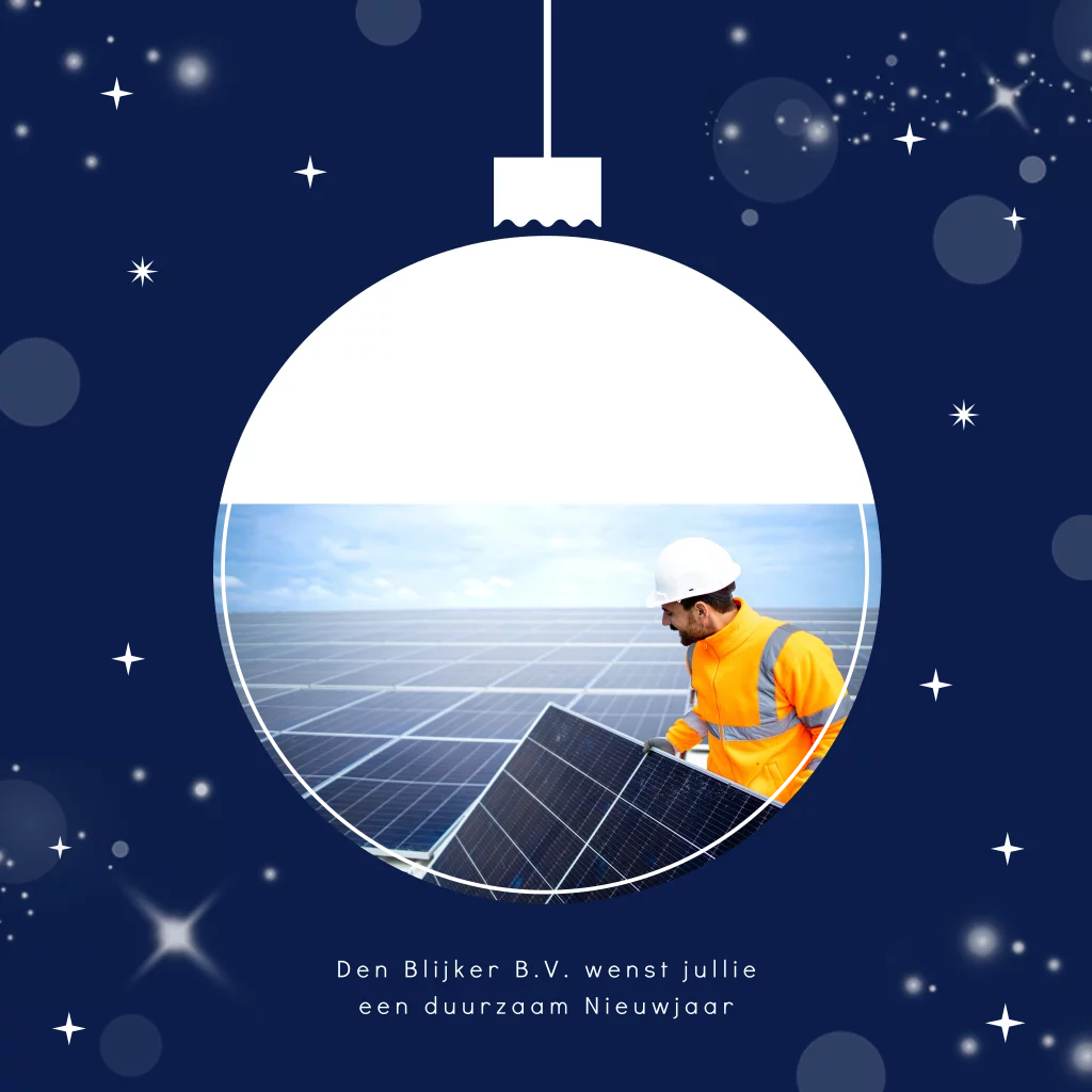 Op zoek naar een zakelijke kerstkaart in de techniek branche? Kies dan voor deze schitterende kerstkaart! Op deze kaart zie je een geïllustreerde kerstbal met daarin de tekst 'Merry Christmas' en een bedrijfsfoto staan. Pas deze zonnepanelen foto aan naar een eigen bedrijfsfoto. De binnenkant van de kerstkaart biedt ruimte voor een eigen bedrijfslogo, waardoor deze kerstkaart een persoonlijke touch krijgt. Kom je er nog niet helemaal uit? Neem dan gerust contact met ons op en dan helpen we je graag verder.