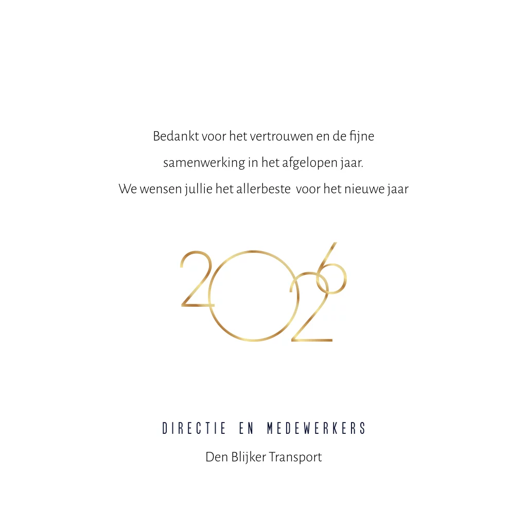 Wens je medewerkers, klanten en zakelijke relaties fijne feestdagen met deze stijlvolle zakelijke kerskaart. Op deze kaart sneeuw met de tekst 'goed op weg'. Origineel aan deze kerst kaart is de foto van een vrachtwagen in het gouden jaartal 2026. Het is ook mogelijk om hier een eigen foto in toe te voegen. Dit kan in onze editor. Hulp nodig bij het aanpassen van deze kaart? Wij helpen je graag!