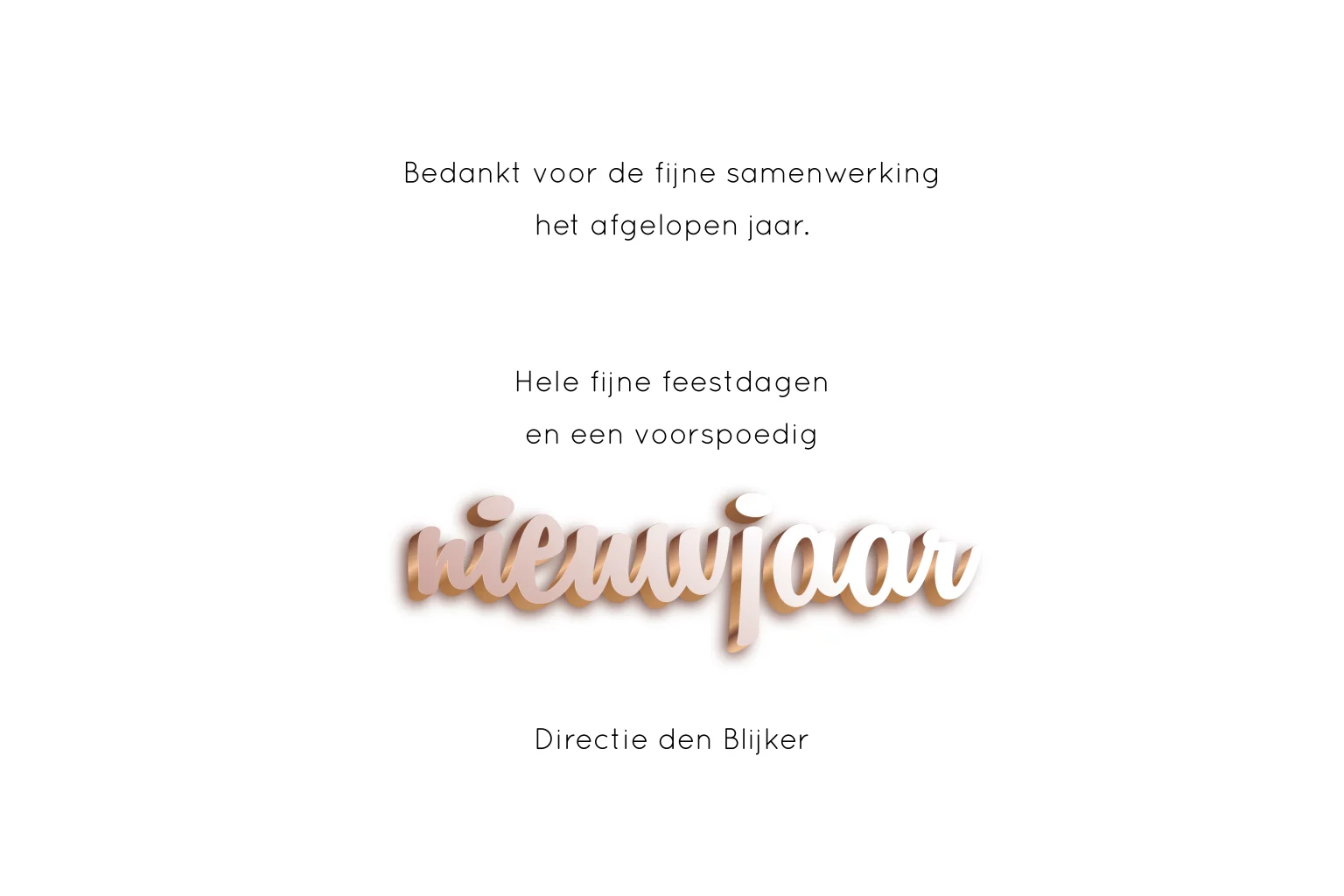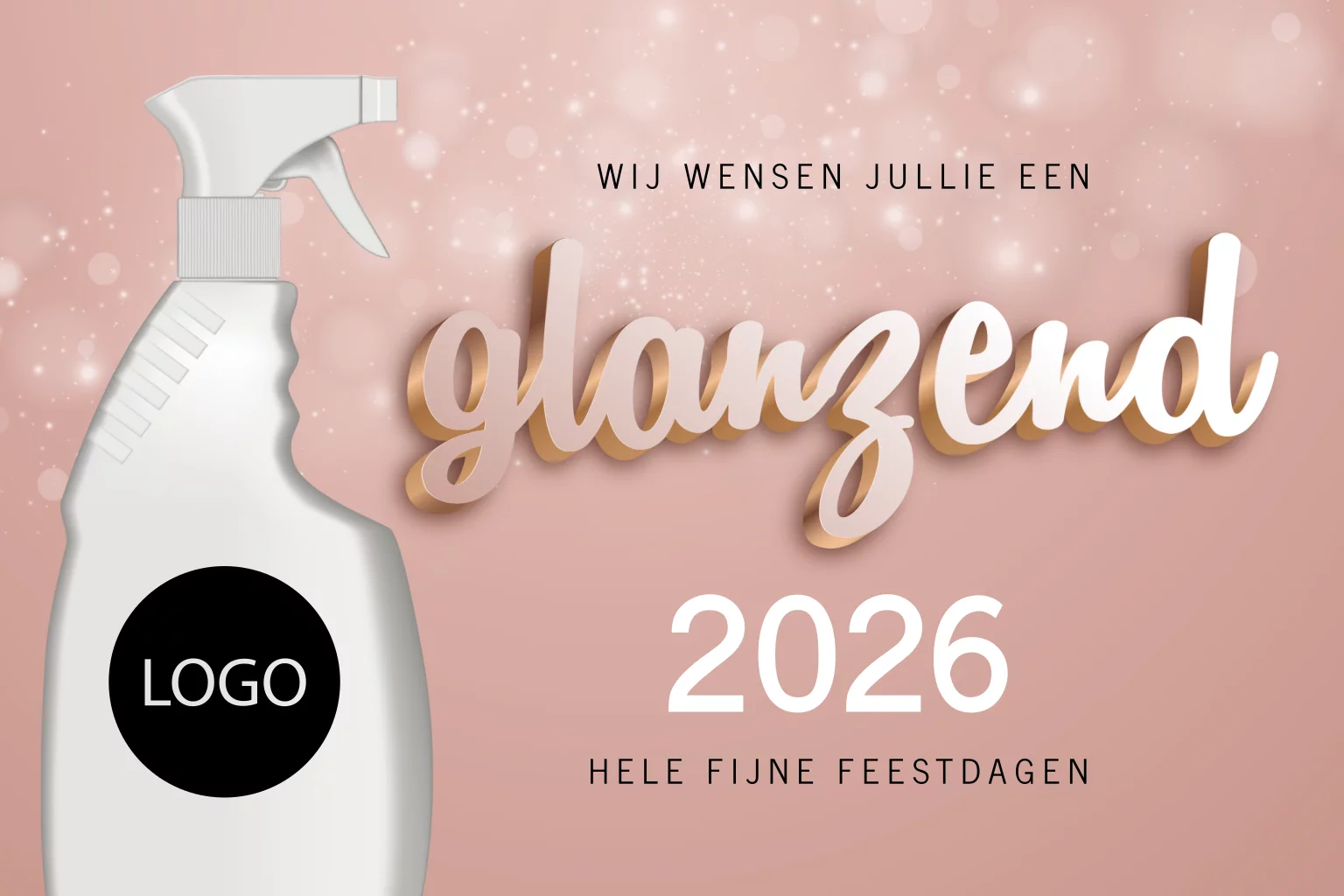 Zakelijke kerstkaart met de sierlijke rosé gouden tekst "glanzend 2026" in 3D. Geschikt voor bedrijven in de facilitaire dienstverlening zoals een schoonmaakbedrijf. Op deze roze kerstkaart een schoonmaak sprayflacon met daarop de mogelijkheid om je eigen bedrijfslogo op te plaatsen. Hulp nodig bij het aanpassen van deze kaart? We helpen je graag!