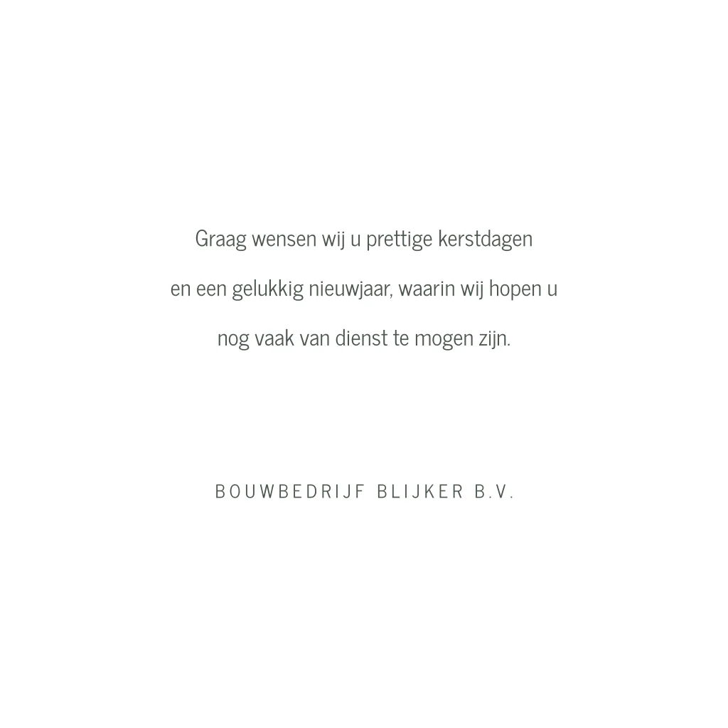 Een zakelijke kerstkaart met een one line tekening aan de voorzijde. De sierlijke tekst aan de voor- en binnenkant van de kaart worden gedrukt met echt goudfolie. Dit geeft de kaart een extra luxe uitstraling. Wil je liever koperfolie, zilverfolie, zwartfolie of roséfolie? Pas het makkelijk aan in onze editor. Aan de binnenkant van de kaart kan het logo worden toegevoegd. Hulp nodig van ons ontwerpteam? Laat het ons gerust weten.
