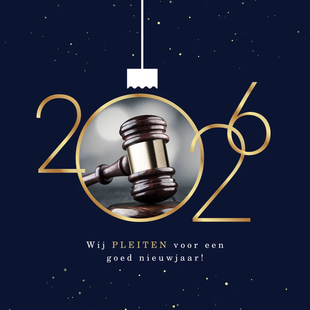 Vier de feestdagen in stijl met deze zakelijke kerstkaart in goudlook voor een advocatenkantoor. Het jaartal 2026 in glinsterend goud maakt deze kaart perfect voor het overbrengen van je beste wensen voor het nieuwe jaar aan je medewerkers, klanten en zakelijke relaties. Op deze kerstkaart staat de tekst 'Wij pleiten voor een goed nieuwjaar!' en je ziet een foto van een rechter hamer. Voeg eventueel een eigen foto toe in de kerstbal. Hulp nodig? We helpen je graag!