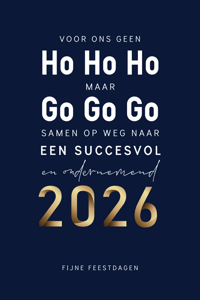Hippe zakelijke kerstkaart met de tekst 'Voor ons geen Ho Ho Ho maar Go Go Go'. Het jaartal 2026 spettert van de kaart af. Deze zakelijke kaart met donkerblauwe achtergrond is voor veel bedrijven te gebruiken en te personaliseren in onze online editor. Het ontwerpteam van Blijkaartje helpt je graag met het aanpassen van de kaart.