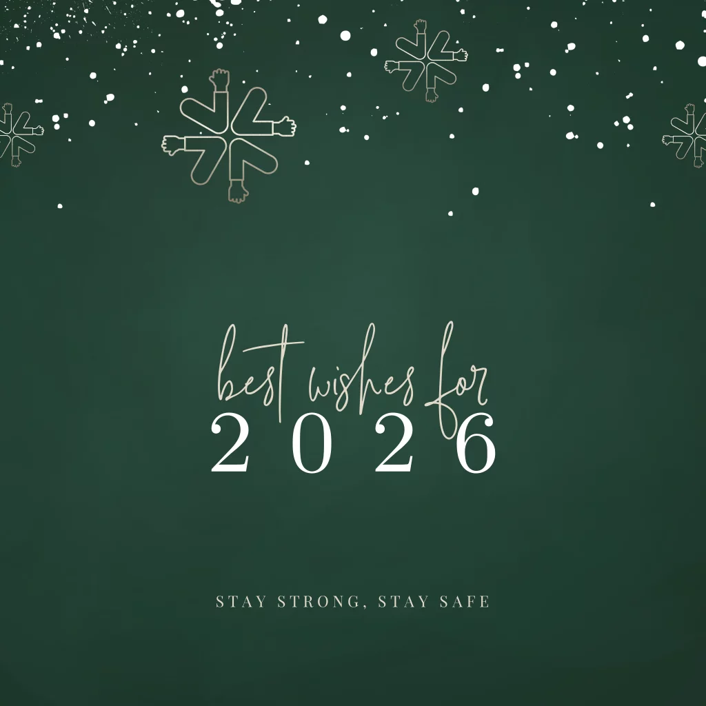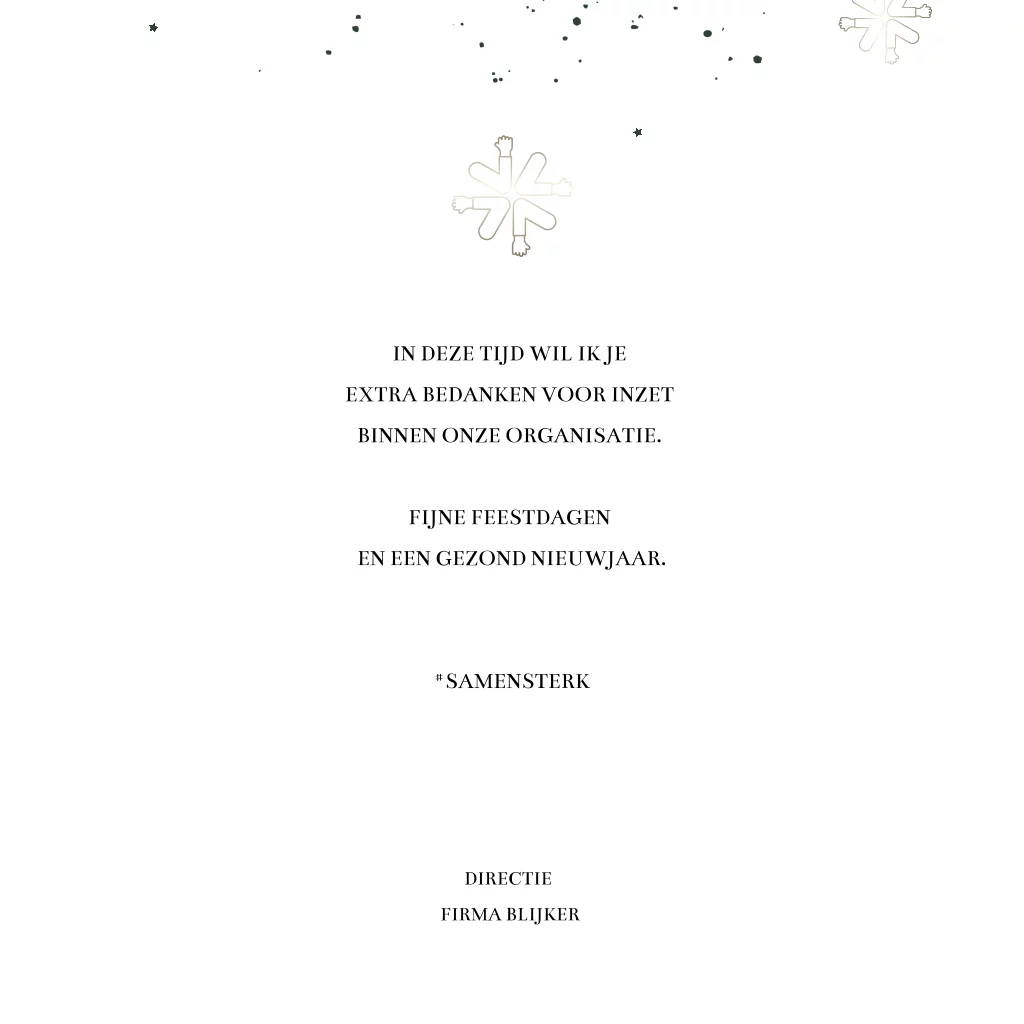 Stay strong, stay safe! Zakelijke kerstkaart met een mooie groene achtergrondkleur en kerststerren in de vorm van de ellebooggroet. Verstuur met deze kaart een persoonlijke kerstwens, met oog voor het bewogen afgelopen jaar. Op deze kaart staat de tekst " Best wishes for 2026". Teksten, kleuren en lettertypes zijn naar eigen wens aan te passen.