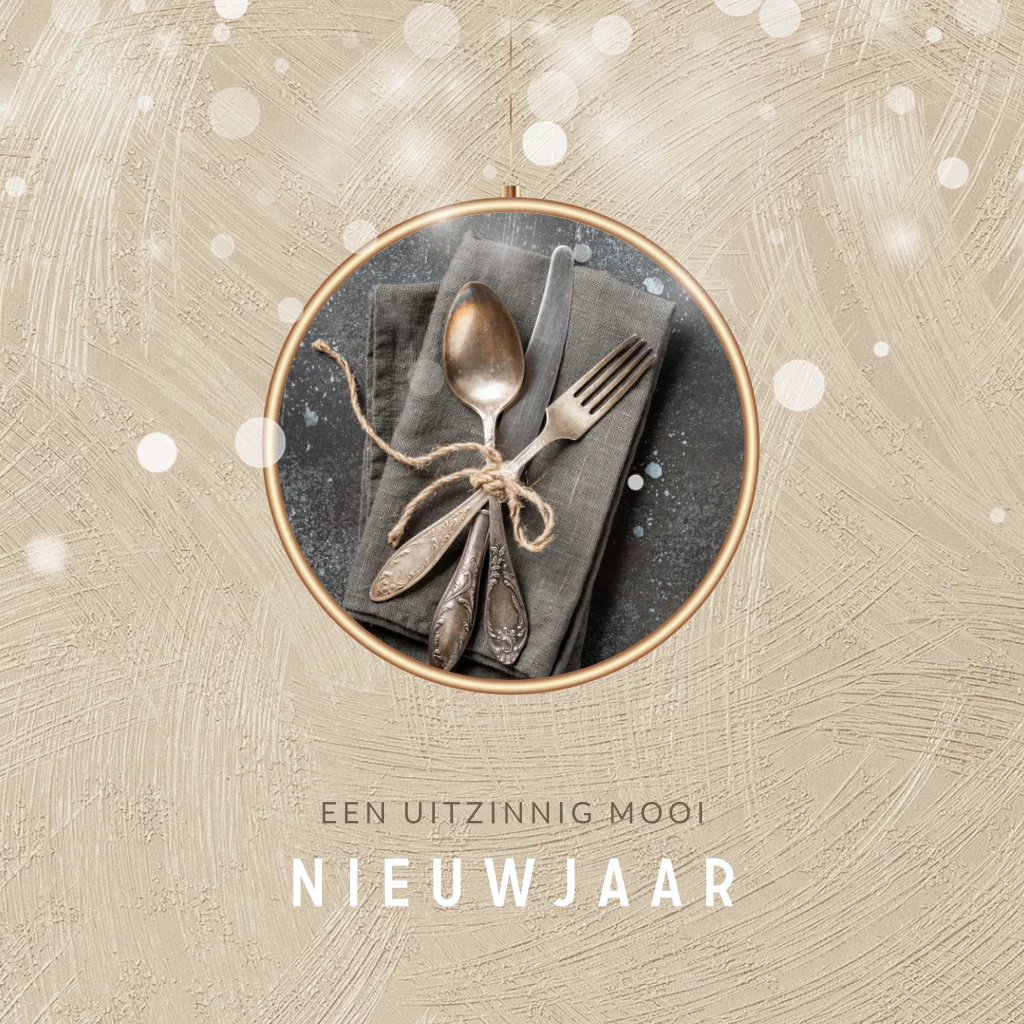 Stijlvolle zakelijke kerstkaart voor een bedrijf in de horeca zoals een café of restaurant. Op deze kaart een kerstbal met foto van bestek. Wens hiermee je klanten, medewerkers en zakelijke relaties een gezellig en uitzinnig nieuw jaar. Hierdoor hebben ze vast zin om in 2026 weer gezellig uit eten te gaan in hun favoriete restaurant. Pas de kleuren en teksten gemakkelijk aan in onze editor. Liever een eigen foto? Dit kun je ook aanpassen in de editor.