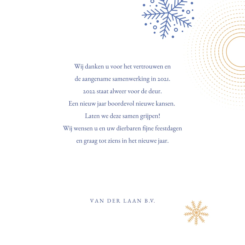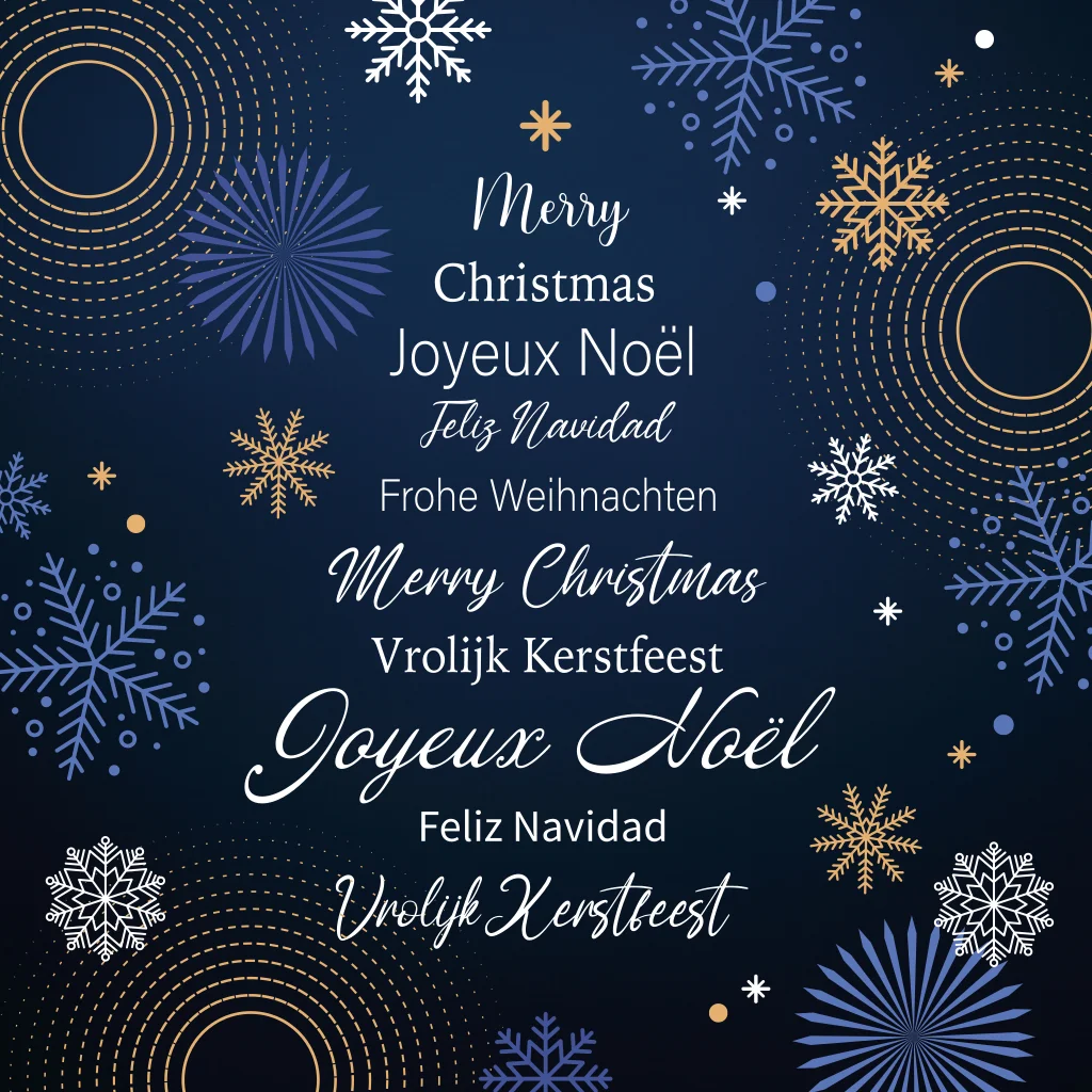 Prachtige zakelijke kerstkaart met de tekst 'Vrolijk Kerstfeest' in verschillende talen. De tekst heeft een combinatie van sierlijke met strakke letters en staat in de vorm van een kerstboom. Op de blauwe achtergrond sneeuwsterren. Deze zakelijke kerstkaart is feestelijk en zeker ook geschikt als particuliere kerstkaart. Teksten, lettertypes en kleuren zijn aan te passen in de editor.