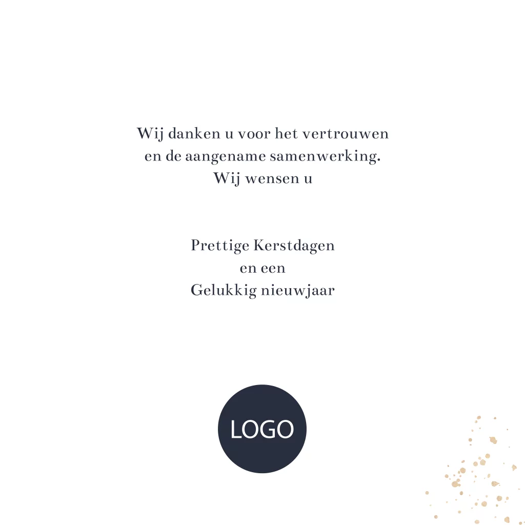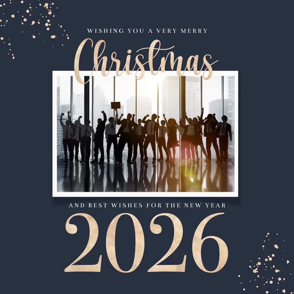 Stijlvolle zakelijke kerstkaart met foto en goudkleurige spetters. Het jaartal staat voluit geschreven. Op de binnenzijde is ruimte voor een bedrijfslogo.