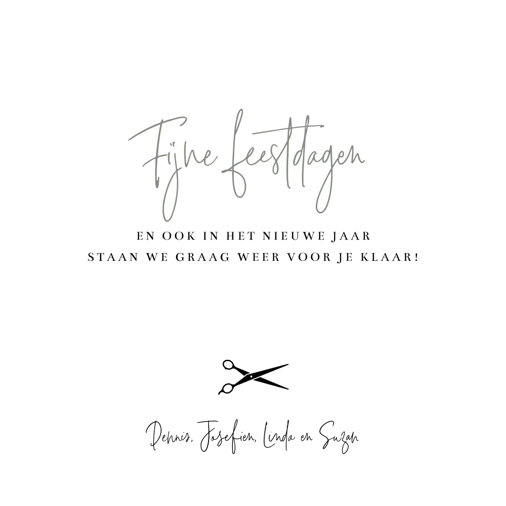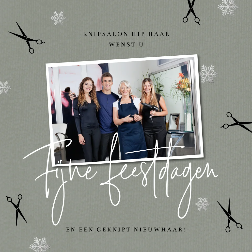 Zakelijke kerstkaart met eigen foto voor een kapper / kapsalon. Deze hippe kerstkaart is gedecoreerd met scharen en kerststerren. Op de binnenkant is ruimte voor een logo.