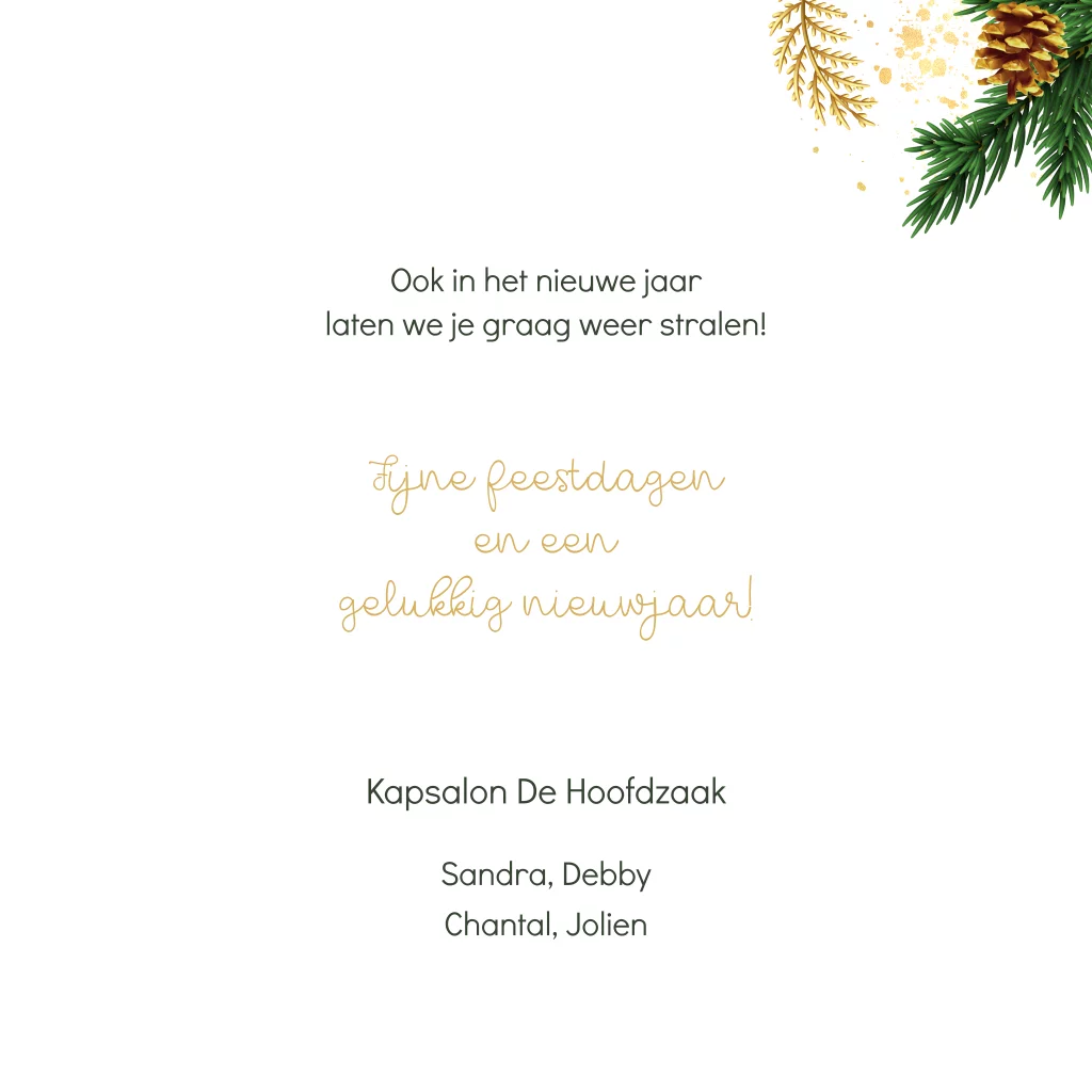 Zakelijke kerstkaart met borstel, schaar en kam, gedecoreerd met kersttakjes en dennenappels. Speciaal voor het kappersvak! Aan de binnenzijde is ruimte voor een logo en kerstgroet.
