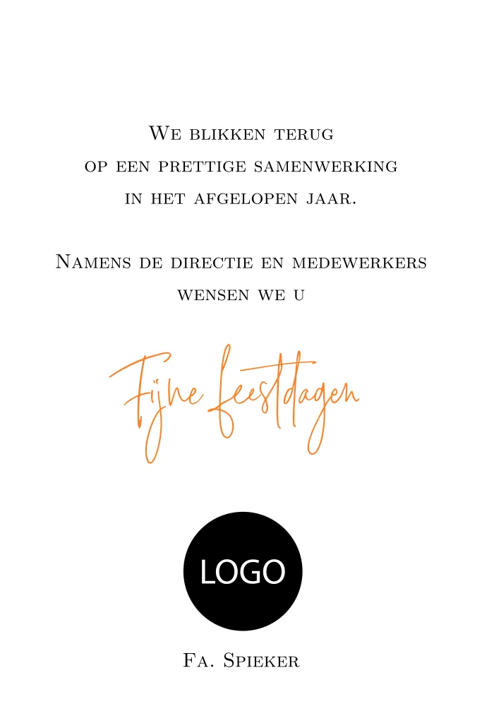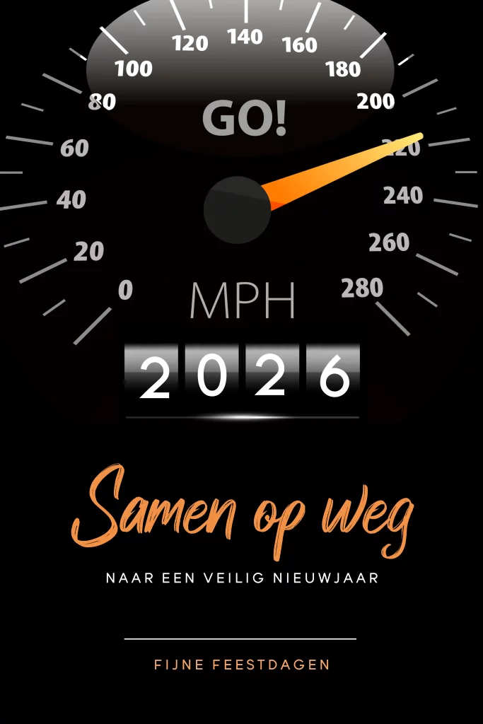 Zakelijke kerstkaart samen op weg naar een veilig nieuwjaar met kilometerteller / snelheidsmeter van een auto. Deze kaart heeft een zwarte achtergrond, een mooie combinatie met de witte en oranje tekst. Op de binnenzijde is ruimte voor een bedrijfslogo.