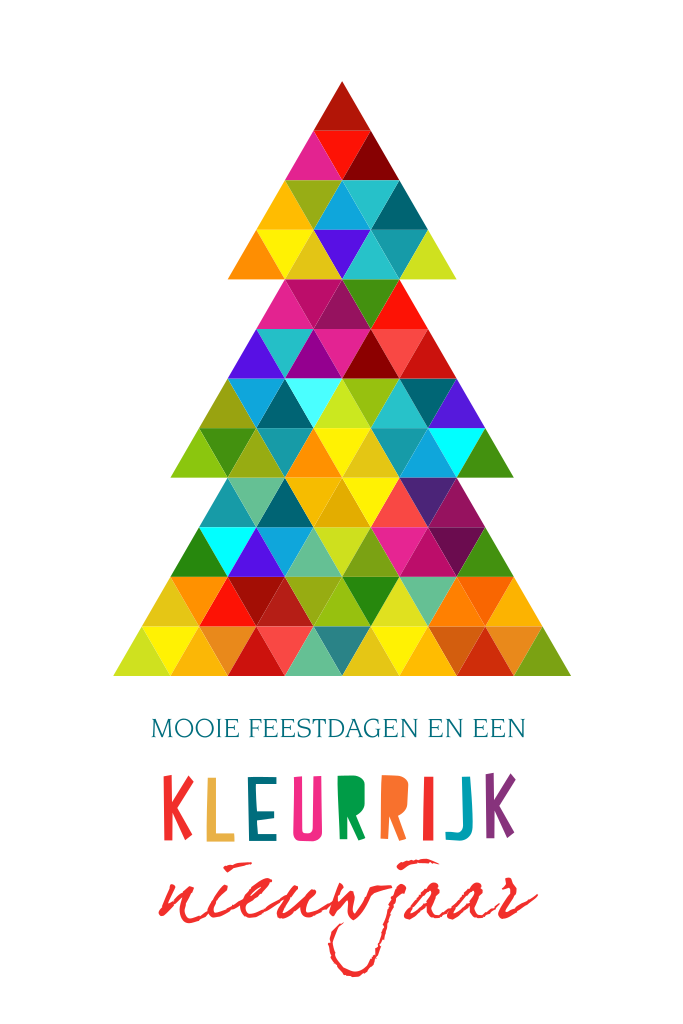 Hou je van kleur of heeft jouw bedrijf affiniteit met kleuren? Dan is deze zakelijke kerstkaart super geschikt. De tekst een kleurrijk nieuwjaar staat in vrolijke kleuren op deze kerstkaart. De kerstboom die uit verschillende gekleurde vlakjes ontstaat is een echte blikvanger.
