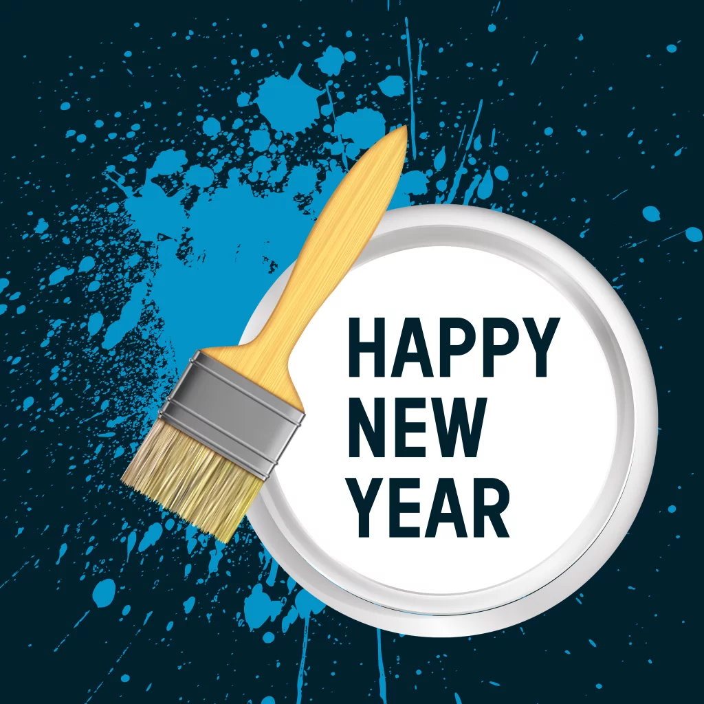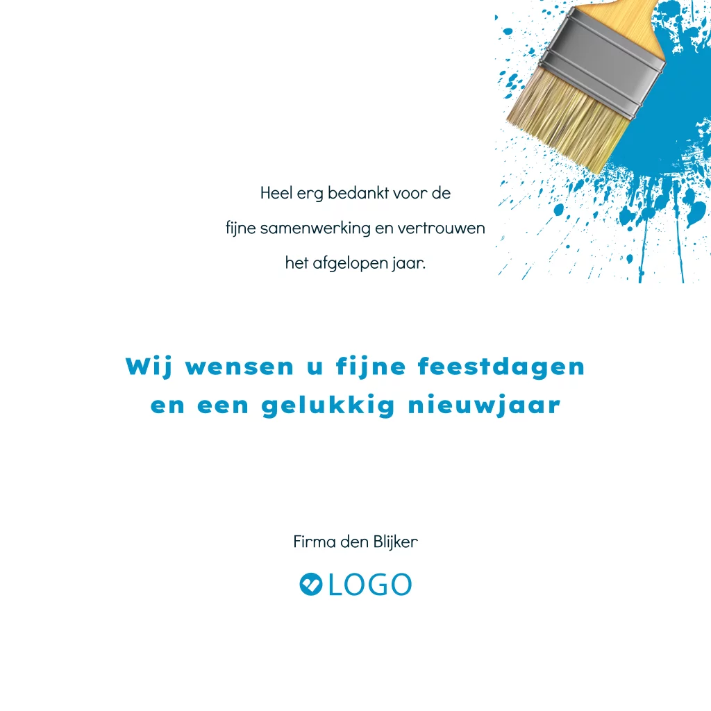 Wens je zakelijke relaties, medewerkers en klanten een Happy New Year met deze zakelijke kerstkaart. Op deze kaart een mooie donkerblauwe achtergrond met verfblik, verfkwast en verfspetters. Perfect voor een schildersbedrijf! De afbeelding van het logo op de binnenzijde dient als voorbeeld en wordt niet gedrukt. Deze kun je verwijderen of plaats hier je eigen logo overheen.