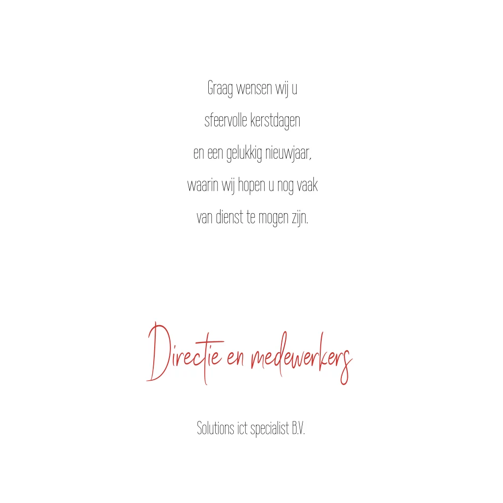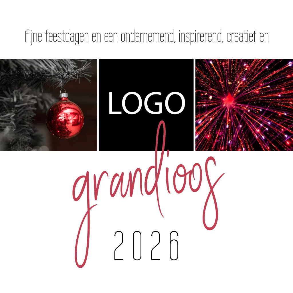 Wens al je zakelijke relaties een grandioos nieuwjaar met deze stijlvolle kerstkaart in roodthema. Op de voorzijde staan 2 mooie foto's en is er ruimte om een eigen bedrijfslogo toe te voegen. Deze zakelijke kerstkaart is geschikt voor alle branches en sectoren. Uiteraard is het mogelijk om de foto's op deze kaart te vervangen door eigen bedrijfsfoto's om de kaart nog persoonlijker te maken. Het ontwerpteam van Blijkaartje helpt je graag bij het aanpassen van de kaart.