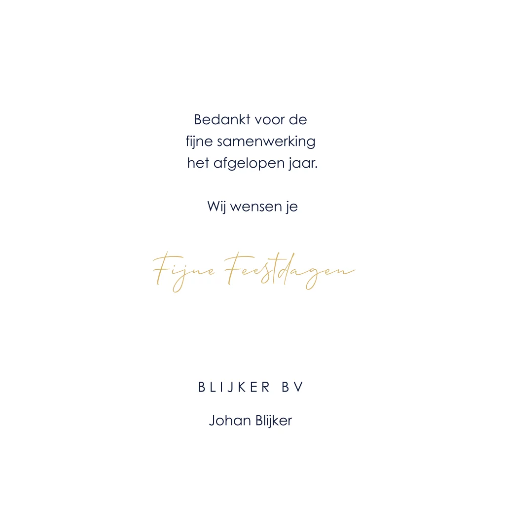 Zakelijke kerstkaart die voor alle bedrijven en sectoren geschikt is. De kaart is wit met donkerblauw. De tekst is in verschillende lettertypes met goudkleurige accenten. Op deze kaart is het mogelijk om zowel op de voor- als op de binnenzijde een eigen bedrijfslogo toe te voegen. Deze kaart is voor alle branches en sectoren geschikt. De gebruikte foto's zijn ook te vervangen voor eigen bedrijfsfoto's. Hulp nodig bij het aanpassen van deze kaart? We helpen je graag!