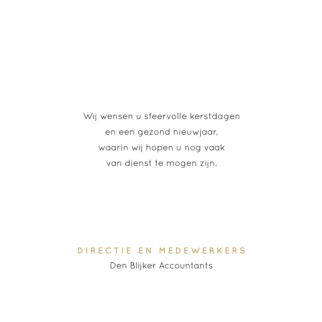 Zakelijke kerstkaart voor bedrijven met een sfeervolle kerstfoto en het jaartal 2026 in mooie goudkleurige cijfers. Op deze kaart is het mogelijk om op de voorzijde een eigen bedrijfslogo toe te voegen. Deze kaart is voor alle branches en sectoren geschikt. De gebruikte foto is ook te vervangen voor een eigen bedrijfsfoto. Hulp nodig bij het aanpassen van deze kaart? We helpen je graag!
