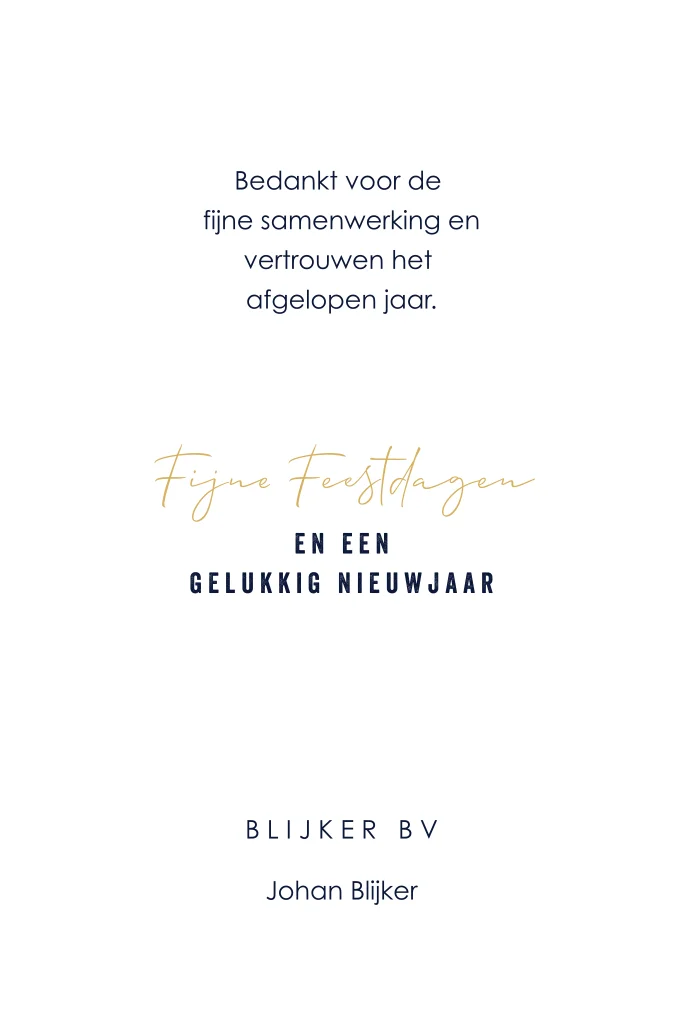 Wil jij je medewerkers of relaties fijne feestdagen wensen? Zeg het met een kerstkaart! Deze zakelijke kerstkaart heeft een mooie donkerblauwe aquarel met tekst in wit en goudkleur. Voeg je eigen bedrijfslogo toe en een persoonlijke kerstgroet. Pas de kaart naar je eigen smaak aan in de editor en combineer met een mooie envelop om het helemaal af te maken.