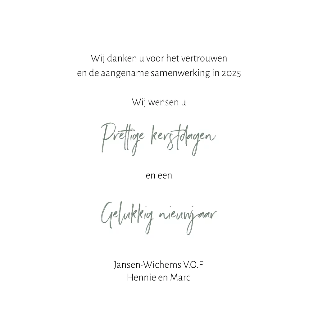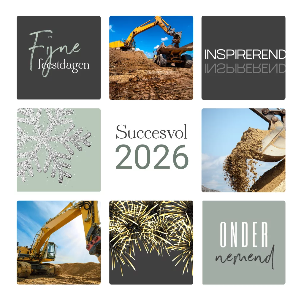 Zakelijke kerstkaart voor een loonbedrijf of grondverzet bedrijf met verschillende vlakken. In deze gekleurde vlakken staan foto's en teksten zoals inspirerend succesvol en ondernemend. De foto's met shovel zijn ook te vervangen voor persoonlijke bedrijfsfoto's. Tevens zijn de kleuren op dit kaartje aan te passen en is er op de binnenzijde ruimte voor een eigen logo.