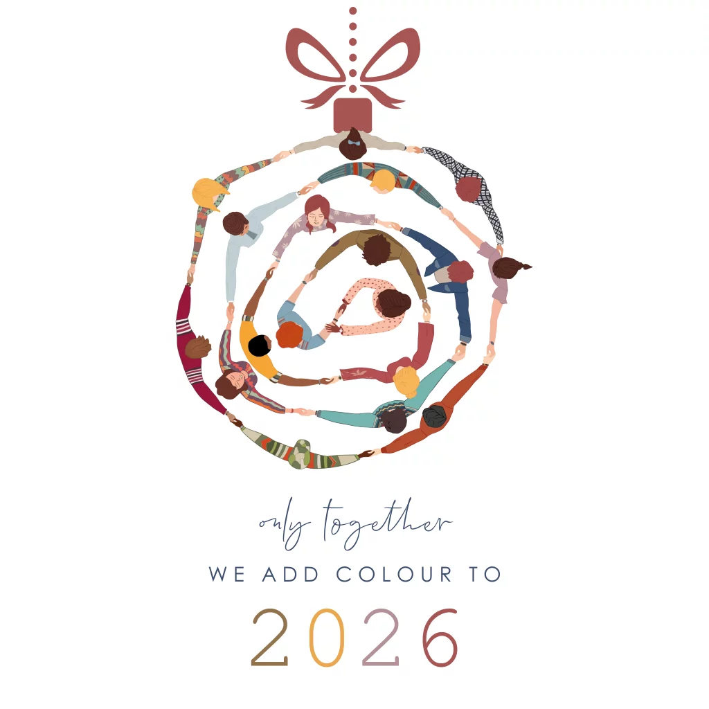 Wens met deze moderne multiculturele kerstkaart je medewerkers, klanten en zakelijke relaties een colorful 2026. Op deze zakelijke kerstkaart een kerstbal van een kring met verschillende mensen en kleuren. Deze kaart is geschikt voor diverse sectoren en branches zoals een bedrijf in de zakelijke of internationale dienstverlening.