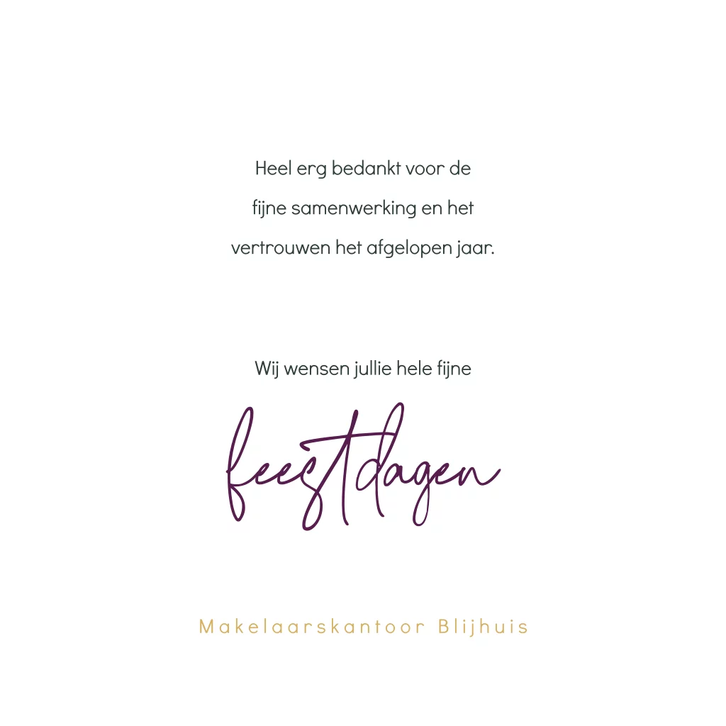 Feestelijke zakelijke kerstkaart met het jaartal 2026. Deze sprankelende kerstkaart laat iedereen in de Kerst stemming komen en is helemaal perfect voor een makelaarskantoor door de sfeerfoto van een sleutel. Wens met deze feestelijke kerstkaart als je zakelijke relaties de allerbeste woonwensen voor 2026. Teksten, kleuren en lettertypes zijn aan te passen in onze online editor. Hulp nodig? We helpen je graag!