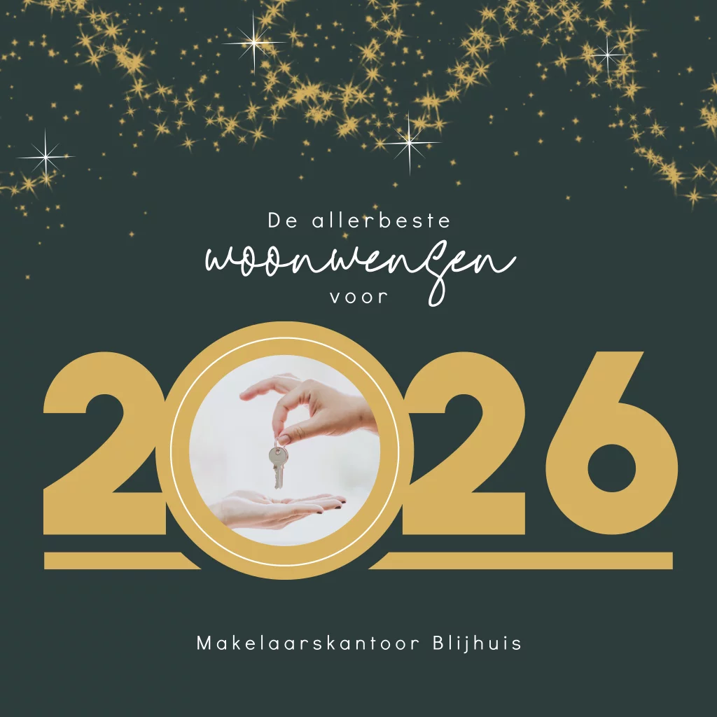 Feestelijke zakelijke kerstkaart met jaartal. Deze sprankelende kerstkaart laat iedereen in de Kerst stemming komen en is helemaal perfect voor een makelaarskantoor door de sfeerfoto van een sleutel. Wens met deze feestelijke kerstkaart als je zakelijke relaties de allerbeste woonwensen voor 2026. Teksten, kleuren en lettertypes zijn aan te passen in onze ontwerpmodule. Kom je er zelf niet uit? We helpen je graag!