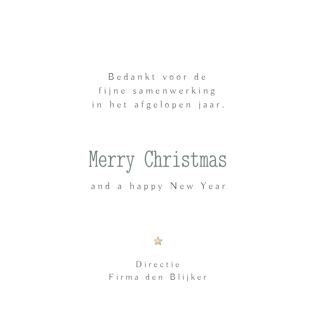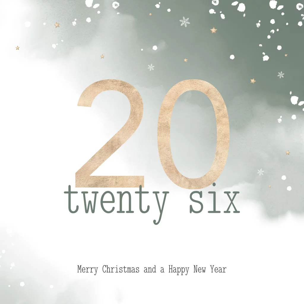Merry Christmas! Een zakelijke kerstkaart met het jaartal op de voorzijde, omringd door sterretjes en spetters. Op de achtergrond een groene aquarel, een trendy combinatie met wit en goudkleur. Geschikt voor alles branches en sectoren. Hulp nodig? Laat het ons gerust weten.
