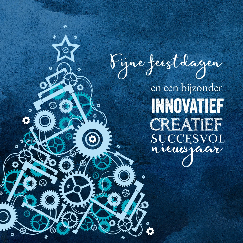 Een zakelijke kerstkaart met kerstboom en tandwielen. Een kaart voor de techniek branche. Het bedrijfslogo kan aan de binnenkant worden geplaatst.