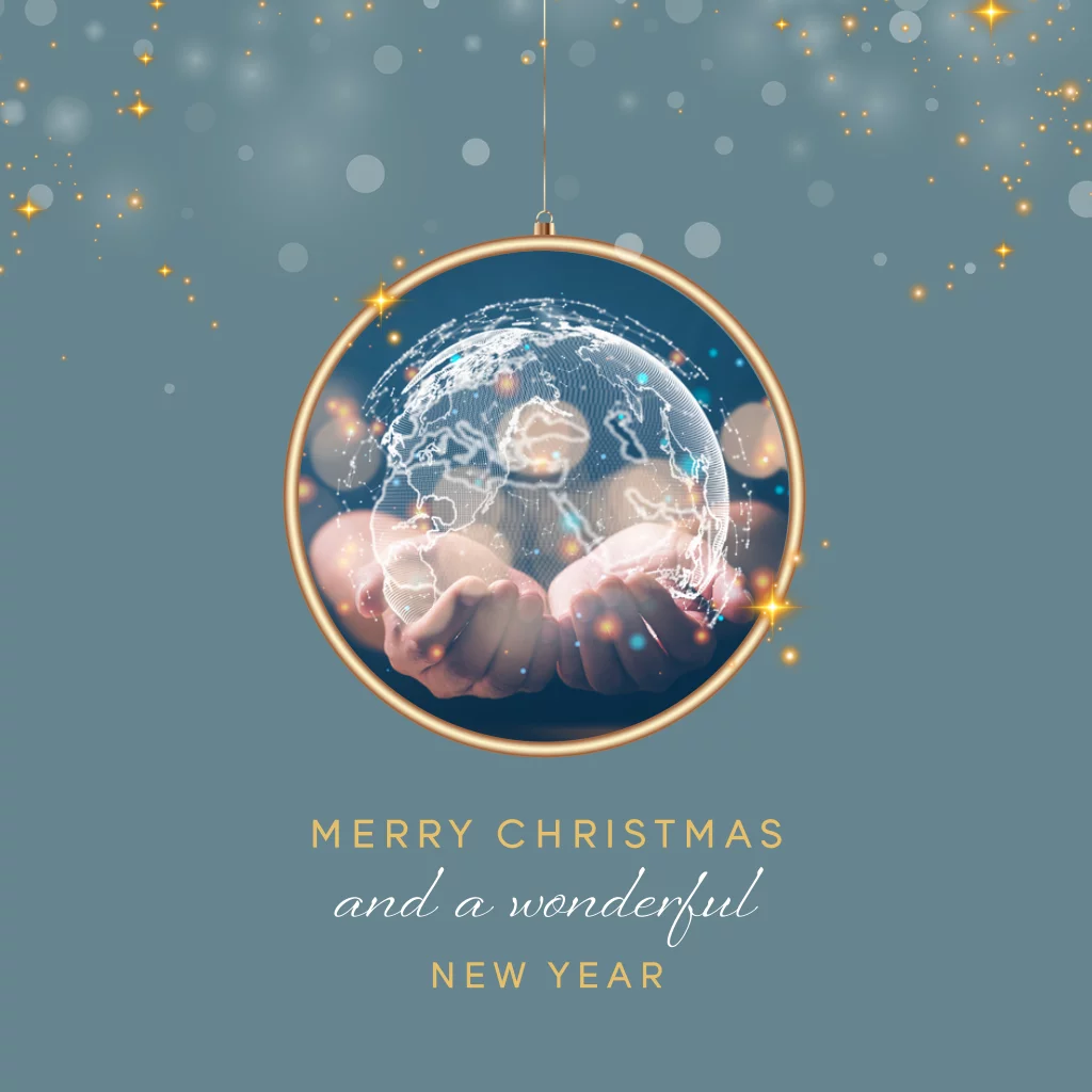 Merry Christmas and a wonderful New Year! Bedank je medewerkers en klanten voor het afgelopen jaar met deze moderne kerstkaart. Op deze kerstkaart een sparkle achtergrond en een kerstbal met daarin een foto van twee handen die een wereldbol vasthouden. Je kunt deze sfeerfoto gemakkelijk vervangen voor een eigen foto. Maak er zo een persoonlijke en originele kaart van! Deze zakelijke kaart is geschikt voor bedrijven zakelijke en internationale dienstverlening zoals een reclamebureau of reisbureau.