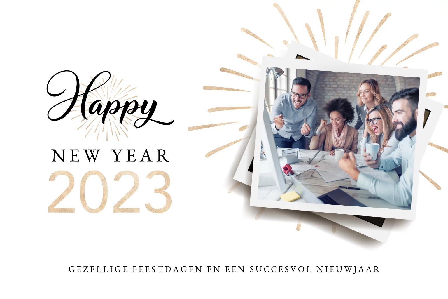 Een zakelijke kerstkaart voor elke branche te gebruiken met foto van het personeel op de voorzijde. Op de achterzijde van de kaart is er ruimte om een bedrijfslogo toe te voegen. De kaart is gemakkelijk aan te passen in onze editor.