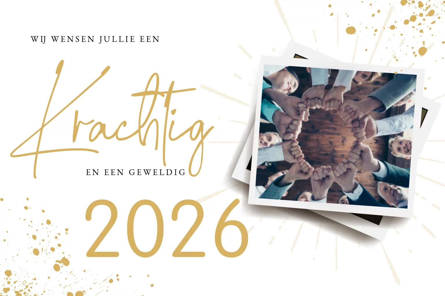 Een zakelijke kerstkaart voor ICT branche met op de voorzijde een foto van het personeel. Achterop de kaart is er ruimte voor een logo. De kaart is gemakkelijk aan te passen in onze editor.