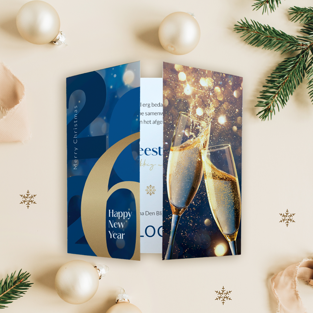 Originele en stijlvolle zakelijke kerstkaart met theatervouw. Op de voorzijde staat het jaartal 2026 met proostende champagneglazen. Zet op de binnenzijde van de kaart je eigen bedrijfslogo. De afbeelding van het logo dient als voorbeeld en wordt niet gedrukt. Deze kun je verwijderen of plaats hier je eigen logo overheen.