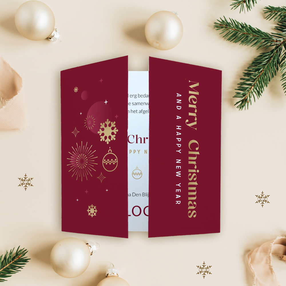 Luxe zakelijke kerstkaart met theatervouw. Bedank je zakelijke relaties voor het afgelopen jaar en stuur ze deze luxe kerstkaart! Deze kerstkaart heeft een originele theatervouw. De kleurencombinatie van rood, wit en goud past perfect bij de kerst. Zet op de binnenzijde van de kaart je eigen bedrijfslogo. De afbeelding van het logo dient als voorbeeld en wordt niet gedrukt. Deze kun je verwijderen of plaats hier je eigen logo overheen.