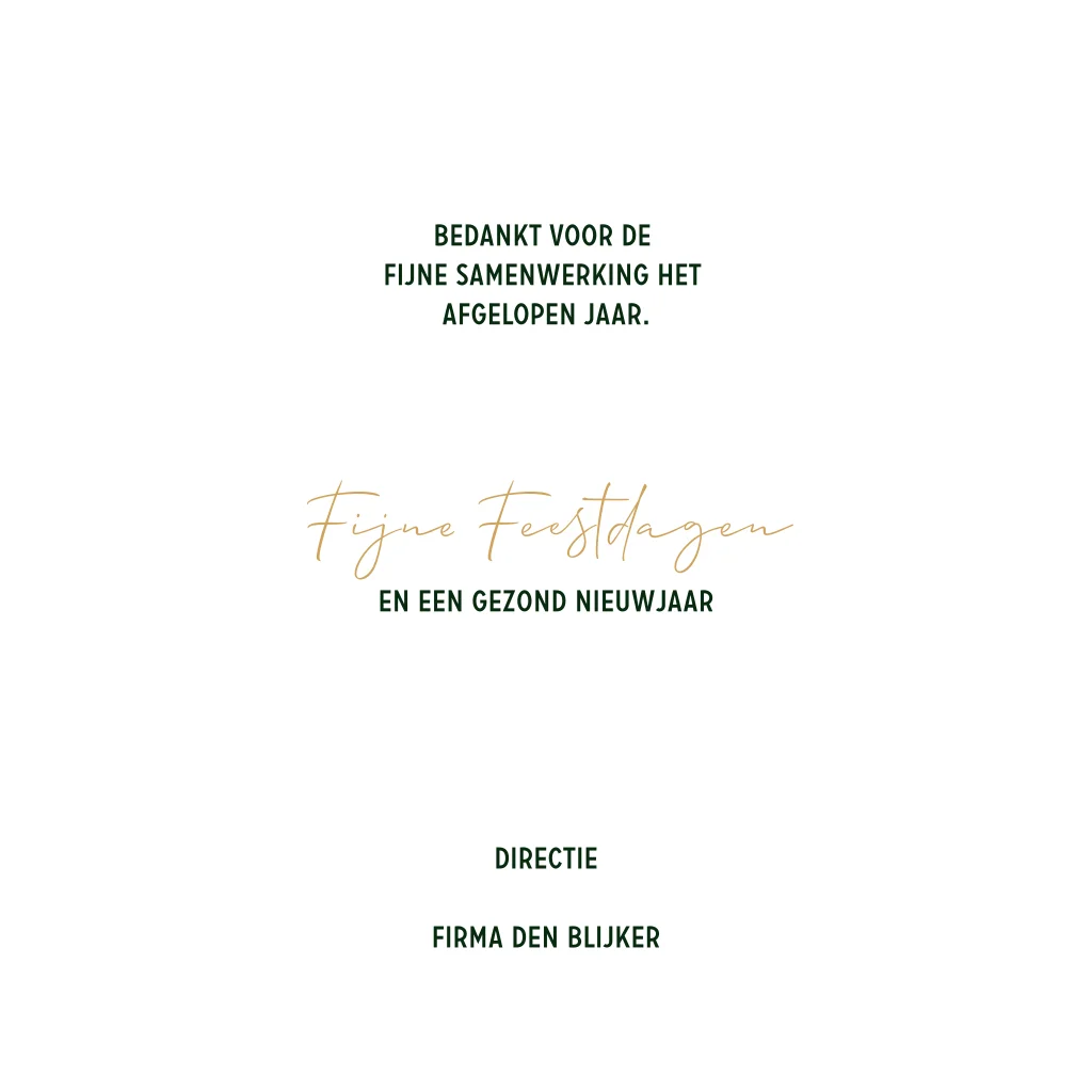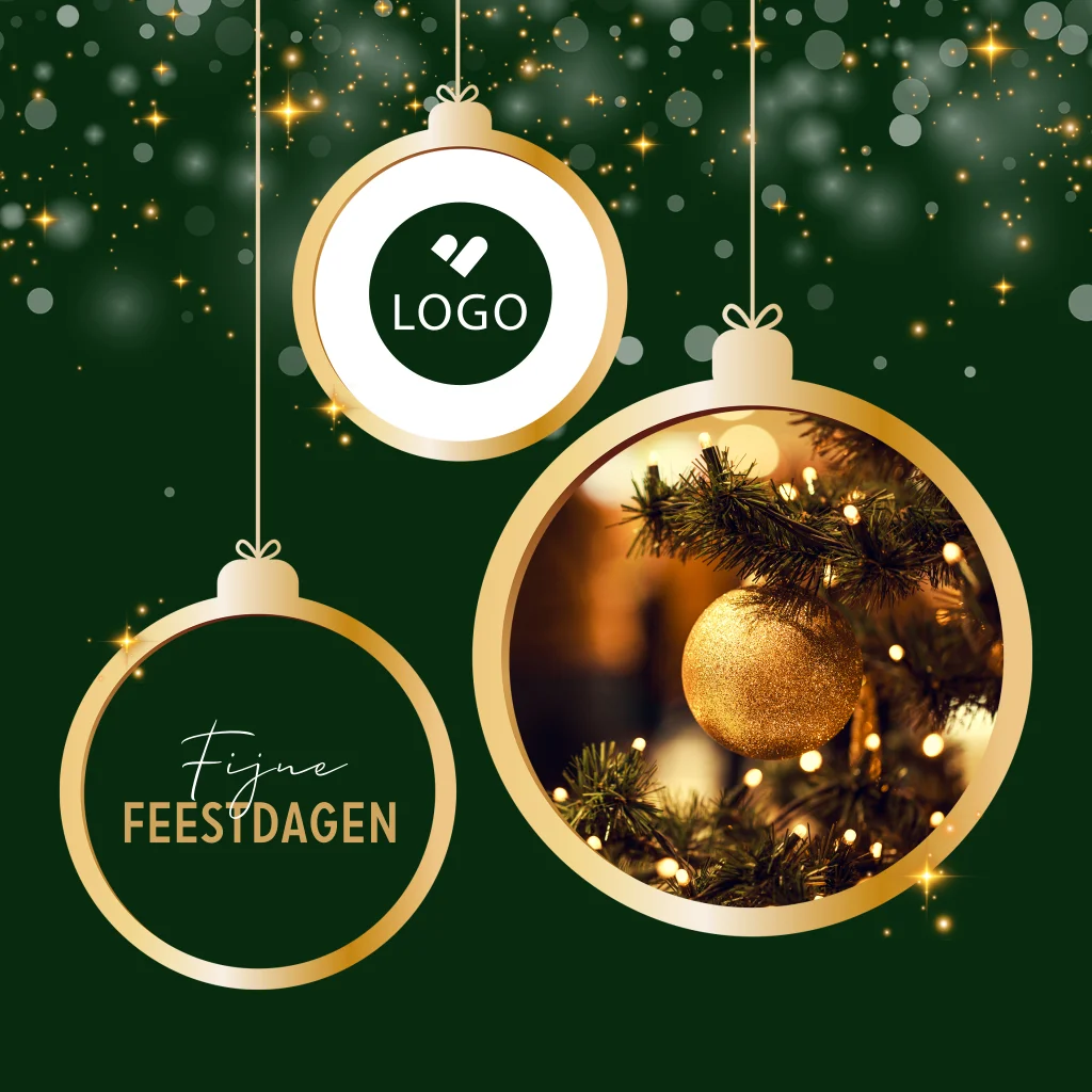 Zakelijke kerstkaart met sparkles en kerstballen. In de kerstballen staat een sfeerfoto, de tekst 'Fijne feestdagen' en kun je je eigen bedrijfslogo toevoegen.