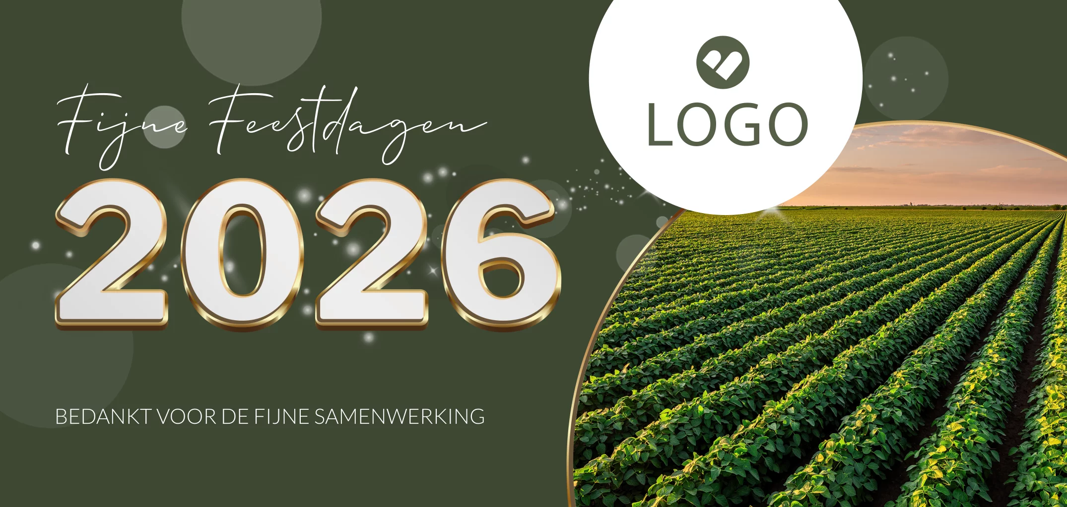 Een zakelijke kerstkaart voor de agrarische sector. Op deze kaart zie je een foto van het land en een kader om je eigen bedrijfslogo toe te voegen. De tekst 'Fijne feestdagen 2026, bedankt voor de fijne samenwerking' is geheel naar eigen wens aan te passen. Met de donkergroene envelop met gouden inlay maak je deze kerstkaart helemaal af.