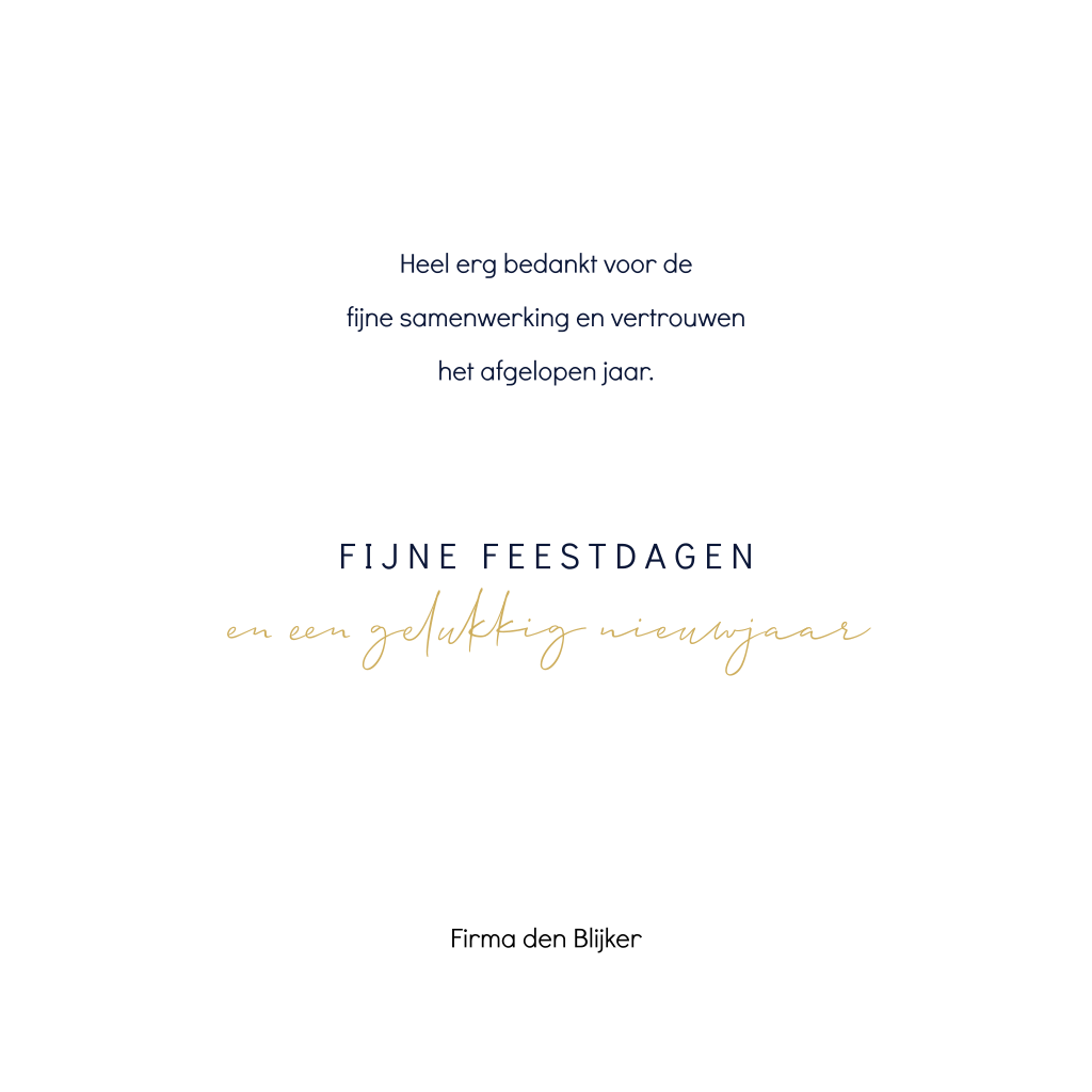 Een hippe zakelijke kerst kaart om klanten of medewerkers een fijne kerst en een gelukkig nieuwjaar te wensen, waarbij je extra stil staat bij de situatie in het afgelopen jaar. Op deze kaart staat de tekst: Bedankt voor je inzet. Op de achtergrond een mooie donkerblauwe kleur, gecombineerd met witte en gouden accenten. Teksten, lettertypes en kleuren zijn aan te passen in de editor. Op de binnenzijde is ruimte om een bedrijfslogo toe te voegen. Geschikt voor alle branches.