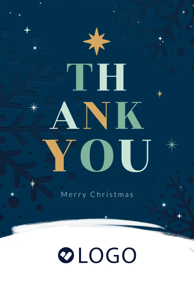 Een prachtige zakelijke kerstkaart om je medewerkers en zakelijke relaties te bedanken voor hun inzet. Op deze kaart zie je de tekst 'Thankyou' staan in de vorm van een kerstboom. Voeg je eigen bedrijfslogo toe om deze kaart extra persoonlijk te maken. De petrol envelopkleur en de ronde hoeken maken deze kerstkaart helemaal af.