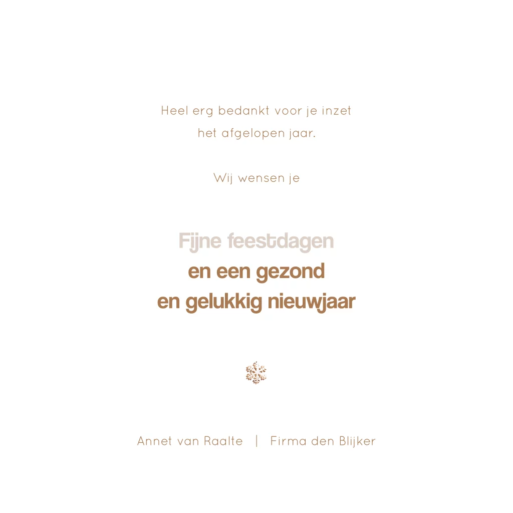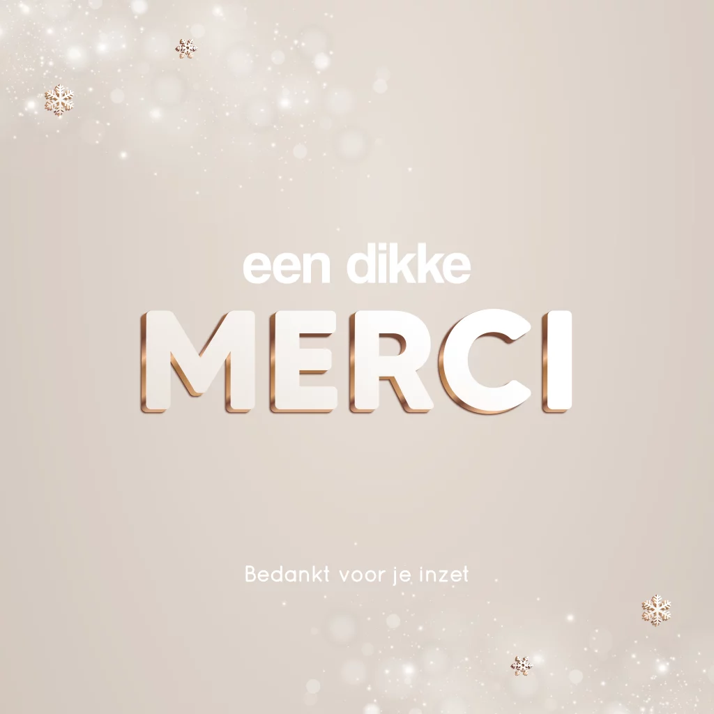 Sprankelende zakelijke kerstkaart om je zakelijke relaties en medewerkers te bedanken voor hun inzet het afgelopen jaar en fijne feestdagen te wensen. De tekst 'Merci' springt er extra uit door het 3D effect. Geschikt voor bedrijven uit diverse sectoren en branches. Op deze kaart een mooie beige achtergrond met roségouden sneeuwvlokken. Hulp nodig bij het aanpassen van deze kaart? We helpen je graag!