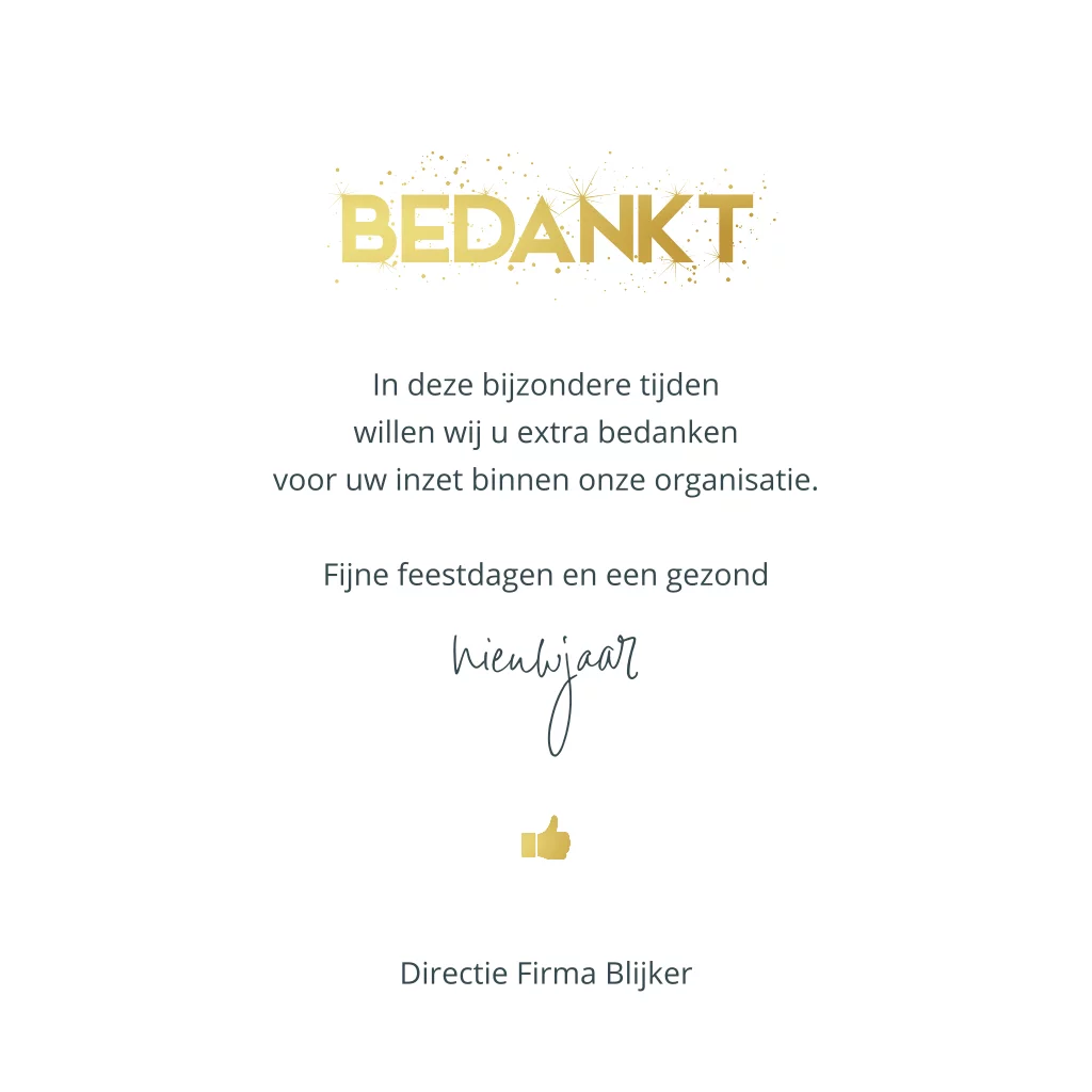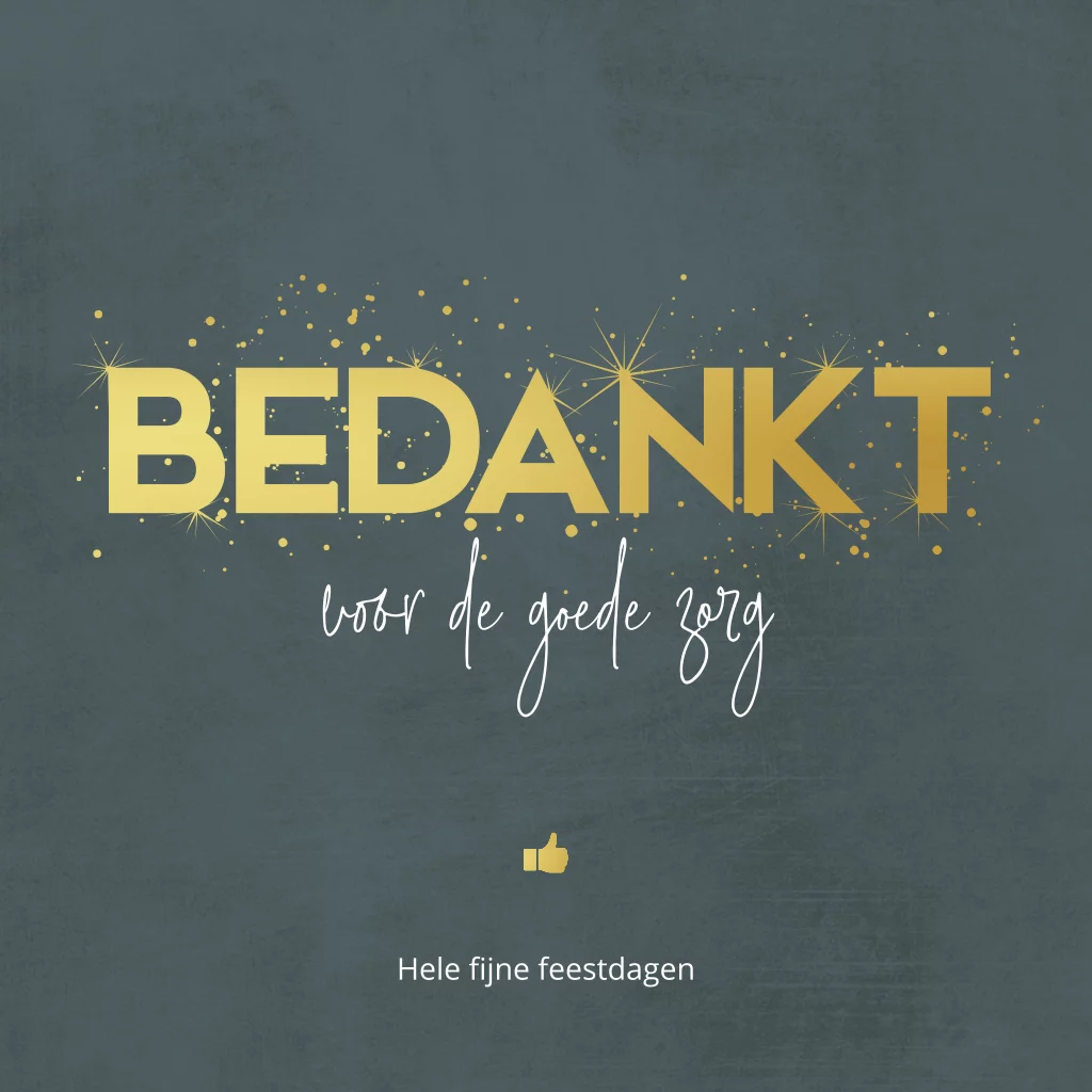 Bedank je fantastische medewerkers, voor de goede zorg, met deze mooie zakelijke kerstkaart. Op deze kaart staat de schitterende tekst "Bedankt" in goudkleur centraal. Een duimpje-omhoog erbij om de waardering extra te benadrukken. Deze hippe kerstkaart is qua tekst makkelijk aan te passen in onze editor. Zo kun je hem geschikt maken voor elke branche of sector. Hulp nodig? Wij helpen je graag verder.