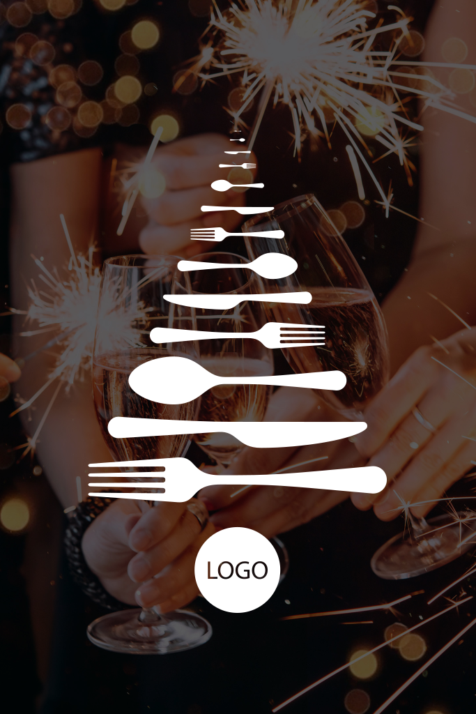 Zakelijke kerstkaart om je medewerkers of klanten fijne feestdagen toe te wensen. Op deze kaart staat een kerstboom gemaakt van bestek met een feestelijke sfeerfoto op de achtergrond. Op deze sfeerfoto proostende champagneglazen en vuurwerk sterretjes. Deze kaart is helemaal geschikt voor bedrijven in de horeca zoals een restaurant of groothandel. Het is mogelijk op de voor- en binnenzijde je eigen bedrijfslogo toe te voegen.