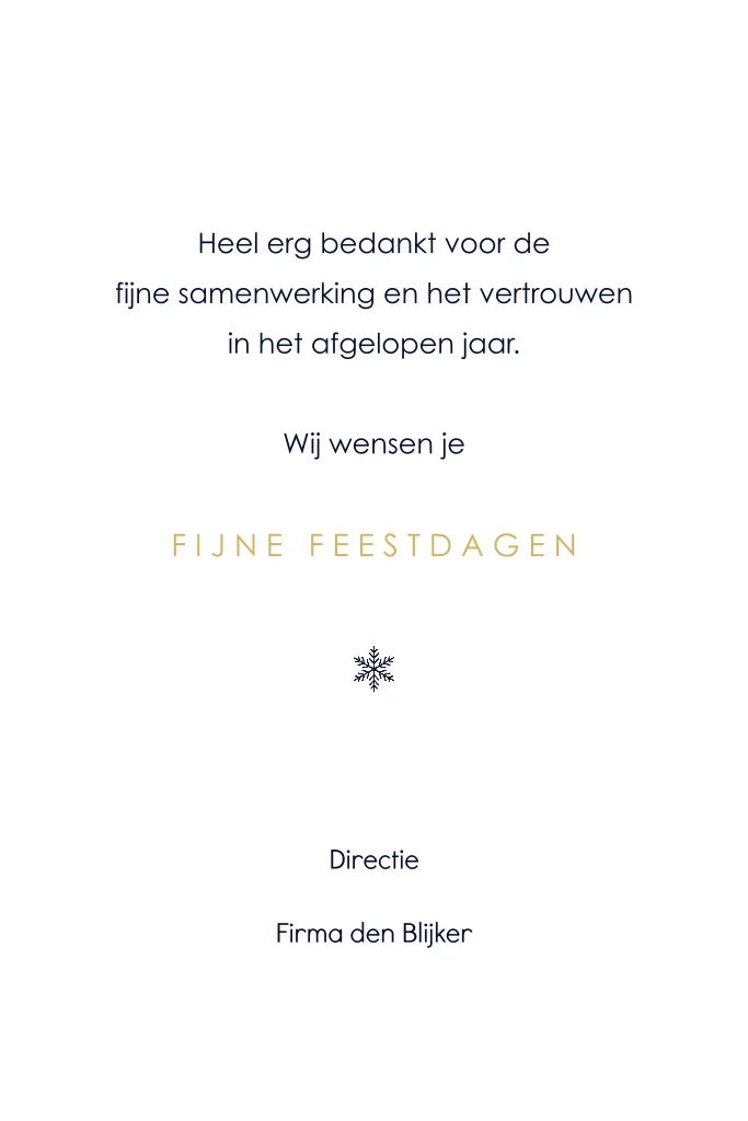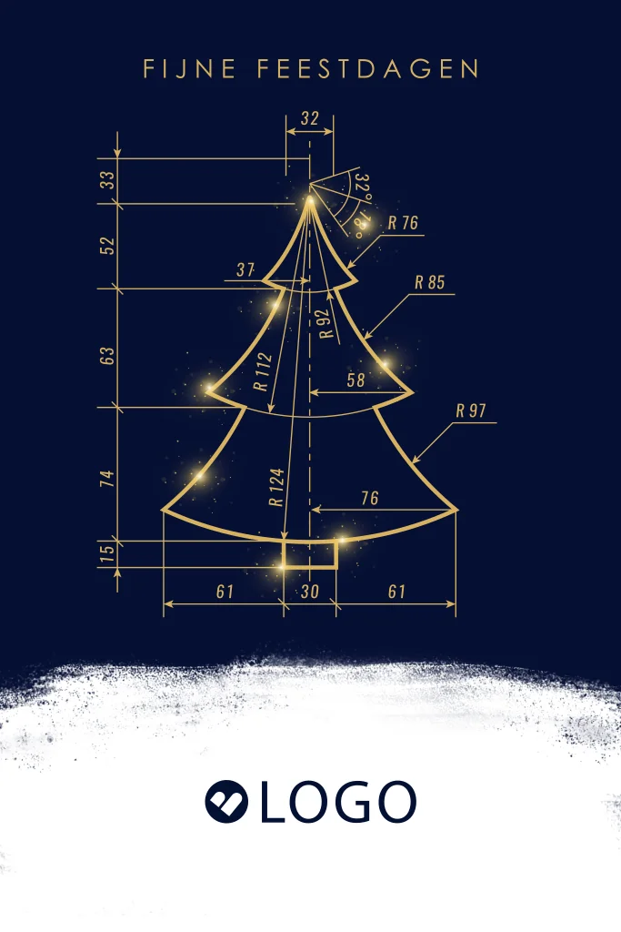 Zakelijke kerstkaart met bouwtekening van een kerstboom om je medewerkers of klanten fijne feestdagen toe te wensen. Op deze kaart staat een spar met allerlei afmetingen en bouw instructies en is het mogelijk op de voorzijde je eigen bedrijfslogo toe te voegen. Deze kaart heeft een donker blauwe achtergrondkleur waarop de goudkleurige tekening mooi uit komt. De bouwtekening maakt deze kaart heel geschikt voor bouwbedrijven of bedrijven in constructie.