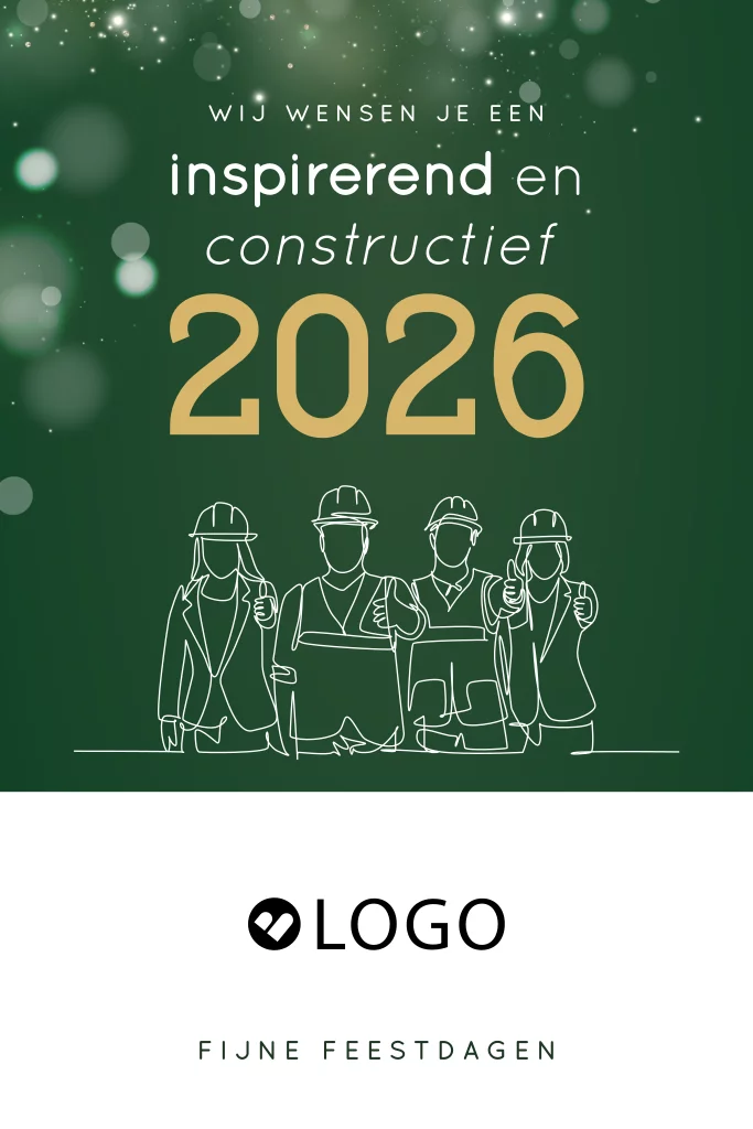 Zakelijke kerstkaart om je medewerkers of klanten fijne feestdagen toe te wensen. Op deze kaart staat het jaartal 2026 in goudkleurige cijfers en een hippe lijntekening van personen die te maken hebben met bouw of constructie. Het is mogelijk op de voorzijde je eigen bedrijfslogo toe te voegen. Deze kaart heeft een warme groene achtergrondkleur met een watercolor effect en kleine sterretjes.