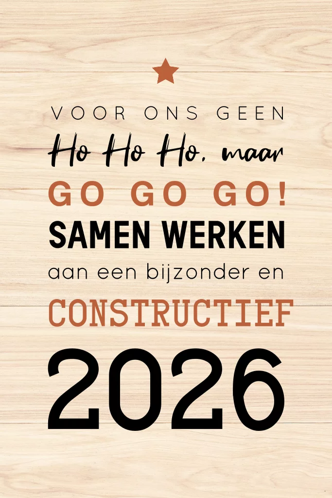 Go Go Go op naar een constructief 2026! Een kerstkaartje met realistische houten achtergrond. Samen bouwen aan een bijzonder en constructief nieuwjaar, is afgebeeld op deze zakelijke kerstkaart. Teksten zijn makkelijk aan te passen in onze editor. Hulp nodig van ons ontwerpteam? Laat het ons gerust weten.