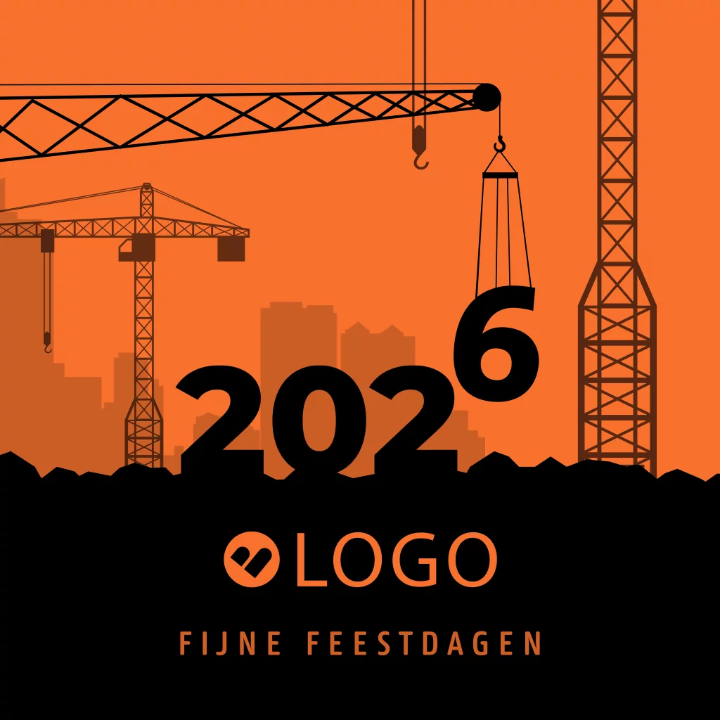 Zakelijke kerstkaart voor bedrijven in de bouw. Op deze kerstkaart zie je een bouwplaats met hijskranen welke 2026 aan het opbouwen zijn. Maak de kaart persoonlijker door er je eigen bedrijfslogo aan toe te voegen.