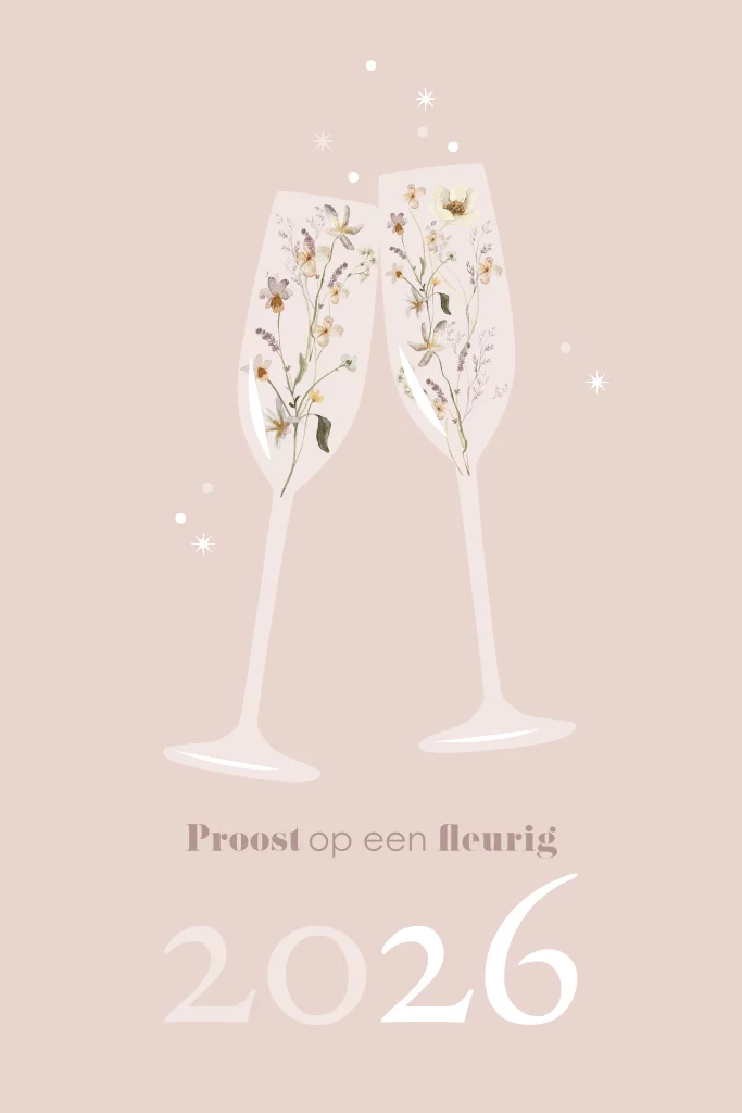 Stijlvolle zakelijke kerstkaart met ronde hoeken. Een originele manier om je medewerkers te bedanken voor hun inzet in het afgelopen jaar en fijne feestdagen en een gelukkig en fleurig 2026 te wensen. Deze uitnodiging heeft een mooie roze kleur met proostende champagneglazen. Extra leuk en origineel aan deze kerstkaart zijn de prachtige bloemen in de champagneglazen. Deze zakelijke kaart is daarom helemaal geschikt voor een bedrijf in de sector groen en natuur zoals een bloemenzaak.