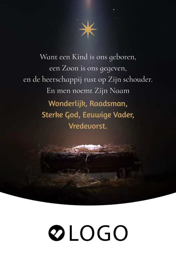 Christelijke kerstkaart met bijbeltekst en foto van een kribbe. Deze kerstkaart kan zowel als reguliere kerstkaart als zakelijke kerstkaart gebruikt worden. Voor een zakelijke variant heb je de mogelijkheid je eigen bedrijfslogo toe te voegen. De afbeelding van het logo dient als voorbeeld en wordt niet gedrukt. Deze kun je verwijderen of plaats hier je eigen logo overheen.