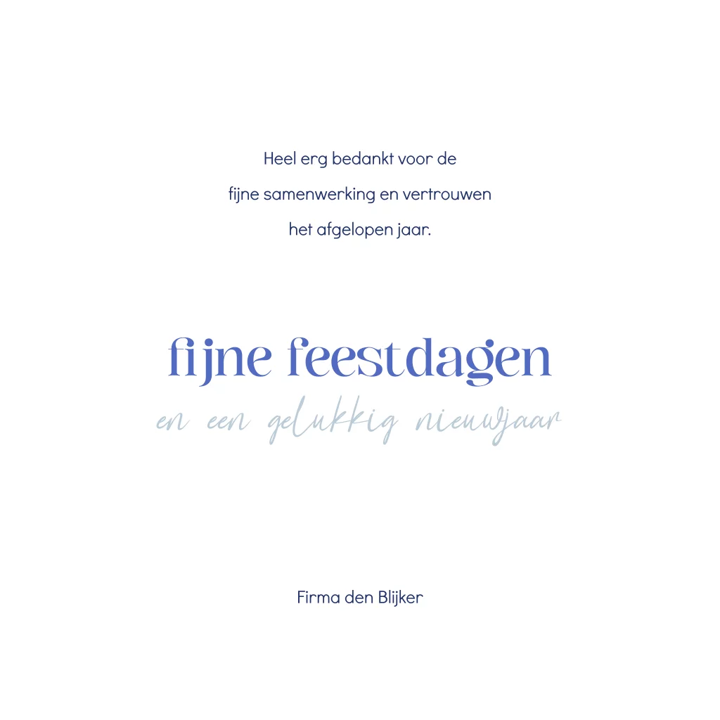 Dag Oud, Hallo Nieuw! Wens met deze stijlvolle zakelijke kerstkaart je klanten, medewerkers en zakelijke relaties fijne feestdagen. Deze kaart is voor alle sectoren geschikt. Teksten, kleuren en lettertypes pas je eenvoudig aan in onze editor. Toch hulp nodig? Wij helpen je graag.