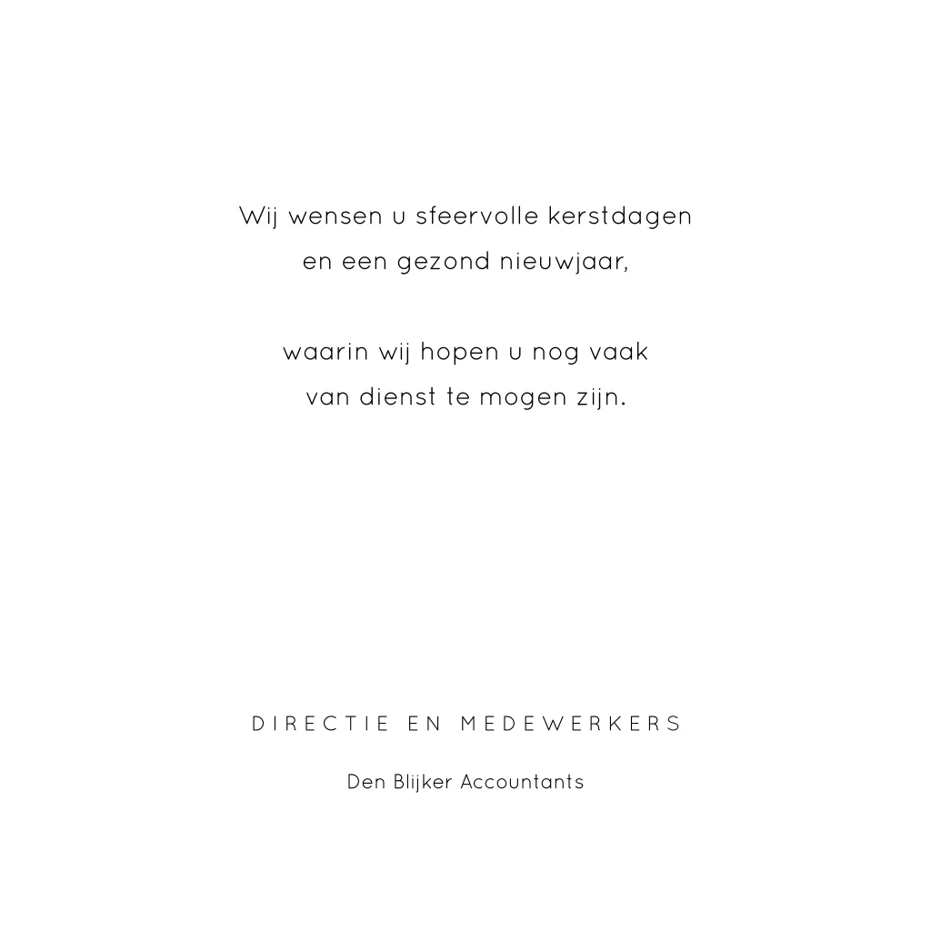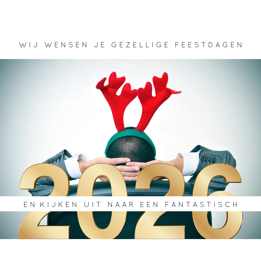 Zakelijke kerstkaart voor bedrijven met een eigen bedrijfsfoto en het jaartal 2026 in mooie goudkleurige cijfers. Deze kaart is voor alle branches en sectoren geschikt. De gebruikte foto is gemakkelijk te vervangen voor een eigen bedrijfsfoto. Hulp nodig bij het aanpassen van deze kaart? We helpen je graag!