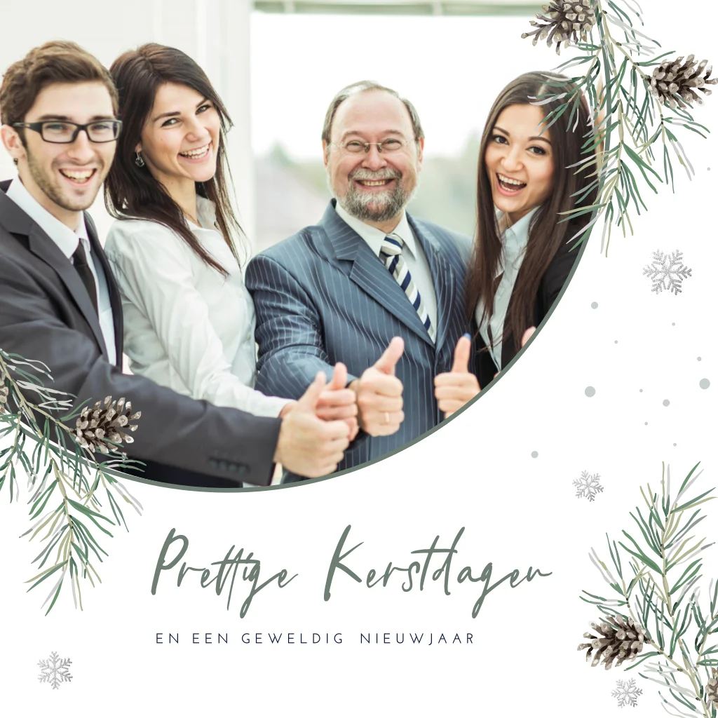 Zakelijke kerstkaart voor verschillende bedrijven met eigen foto. Op deze kerstkaart staat de foto in een halve cirkel en wordt deze omringt met dennentakjes, dennenappels en zilverkleurige sneeuwvlokjes. De traditionele kerst elementen in combinatie met zacht groene kleurtinten maakt dat deze kaart met eigen bedrijfsfoto een mooie uitstraling heeft.