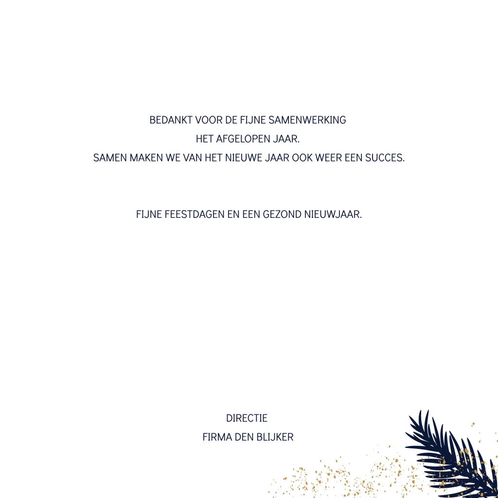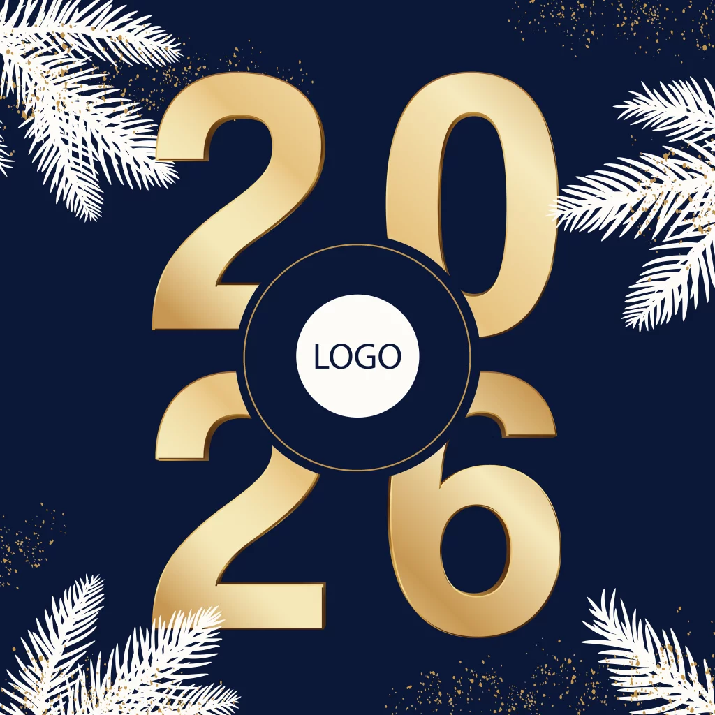 Zakelijke kerstkaart met jaartal en logo. Het jaartal 2026 staat prominent op de kaart in mooie goudkleurige cijfers. In het midden is er ruimte om een eigen bedrijfslogo toe te voegen. De kaart heeft een mooie donkerblauwe achtergrondkleur en is verder gedecoreerd met verschillende kersttakjes, waaronder dennentakjes en hulst, kleine dennenappels en spetters. Deze zakelijke kerstkaart is voor elke branche of sector te gebruiken.