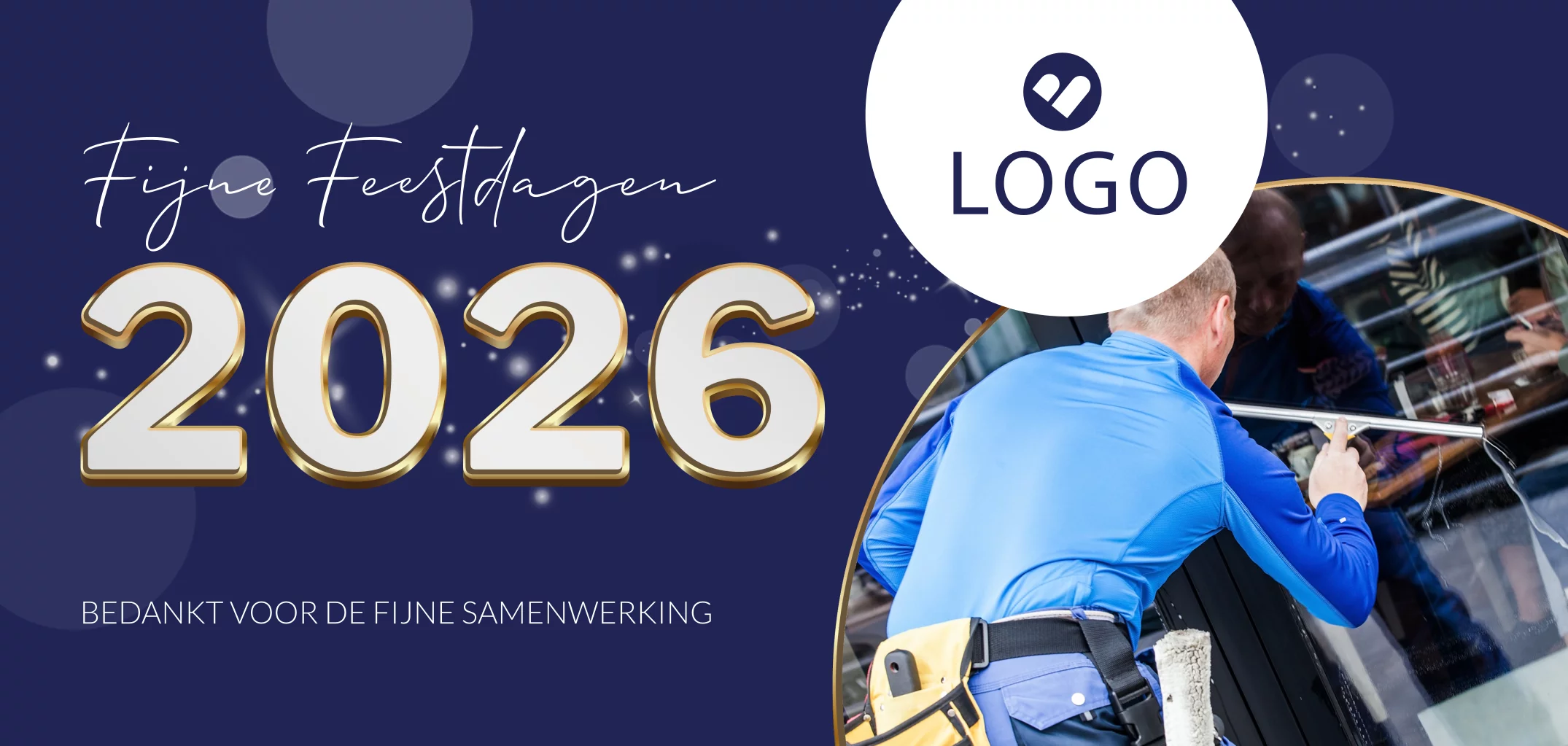 Ben je op zoek naar een stoere zakelijke kerstkaart voor de facilitaire dienstverlening? Kies dan voor deze stralende kerstkaart met een foto van een glazenwasser. Voeg je eigen bedrijfslogo en foto toe om een persoonlijk tintje toe te voegen. Op deze kaart staat de tekst ´Fijne feestdagen 2026, bedankt voor de fijne samenwerking´. Hulp nodig? We helpen je graag!